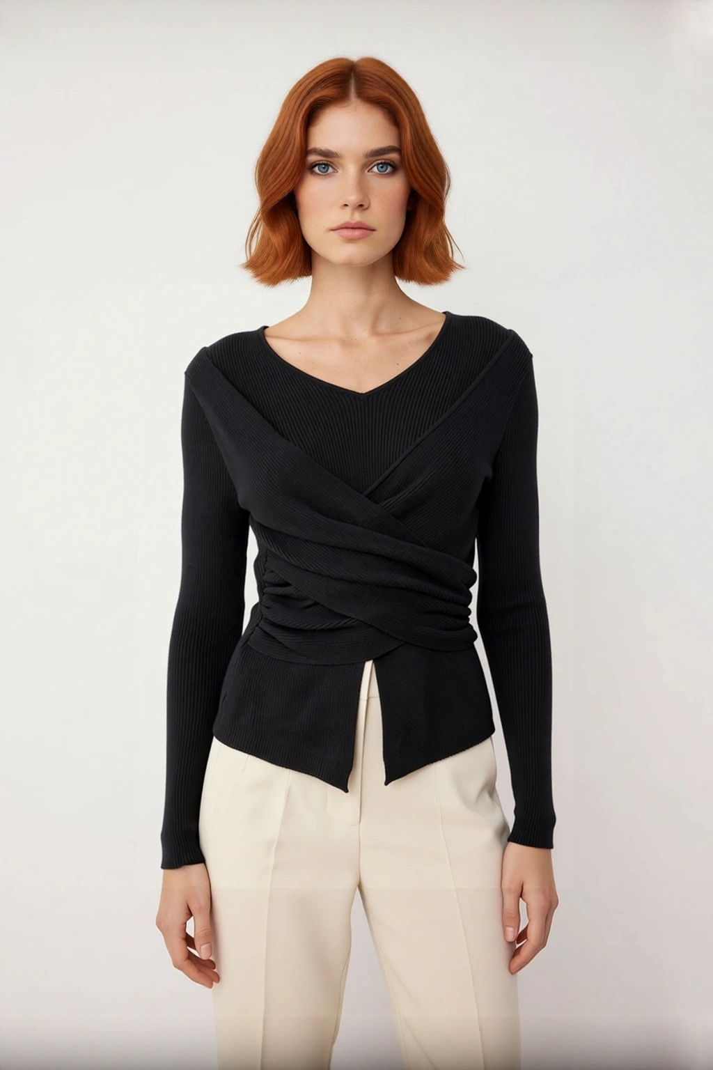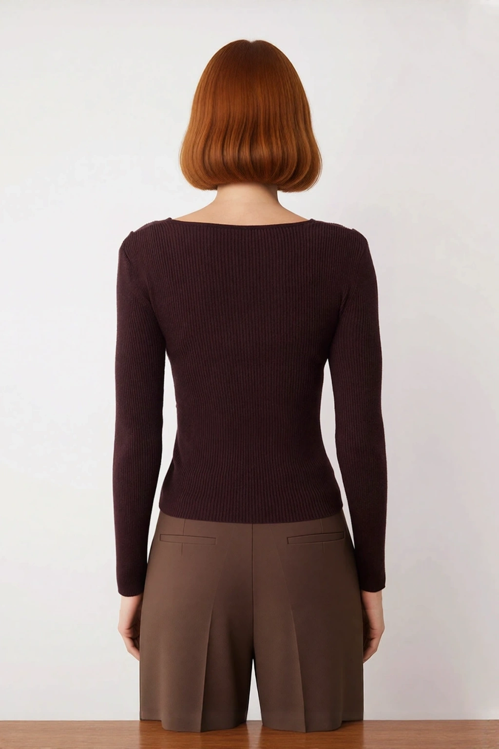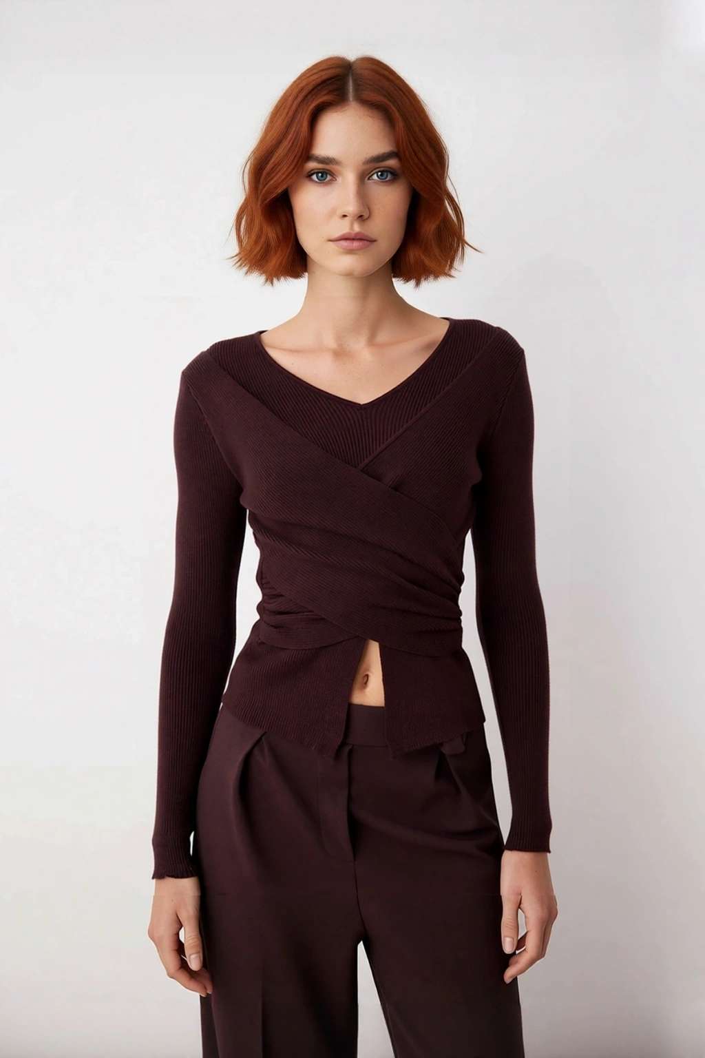 Ürün Özellikleri: Fitted kalıp, viskoz polyester poliamid materyal, düz desen, V yaka, standart uzun kol, fitilli triko kumaş, kahverengi renk, drape detaylı tasarım.