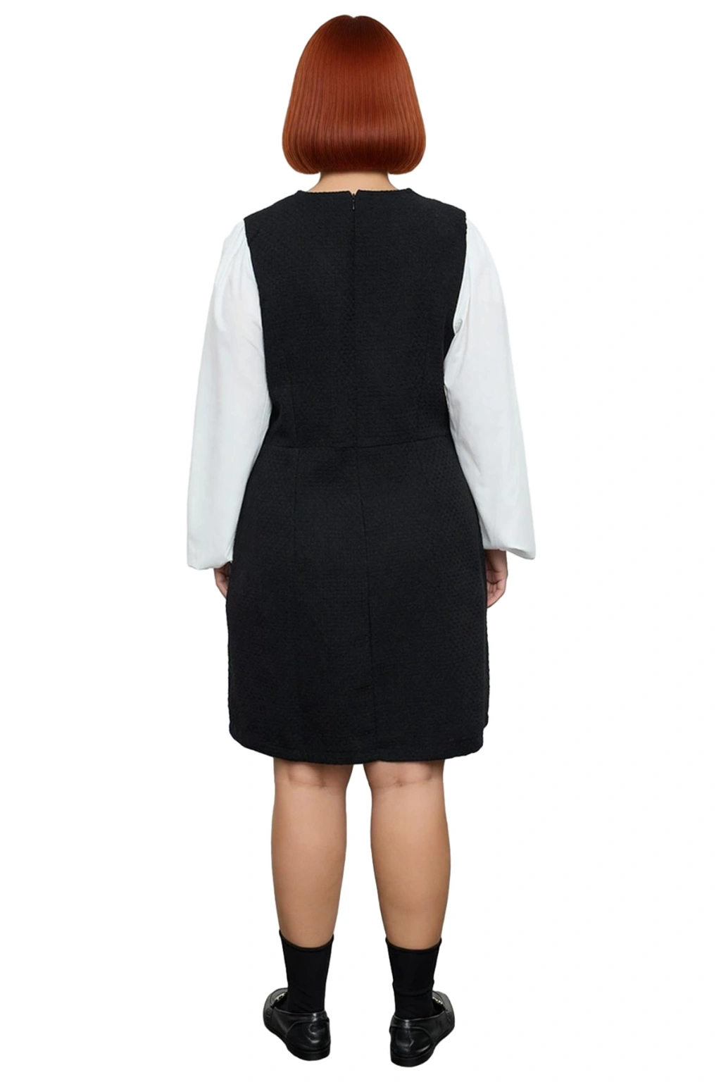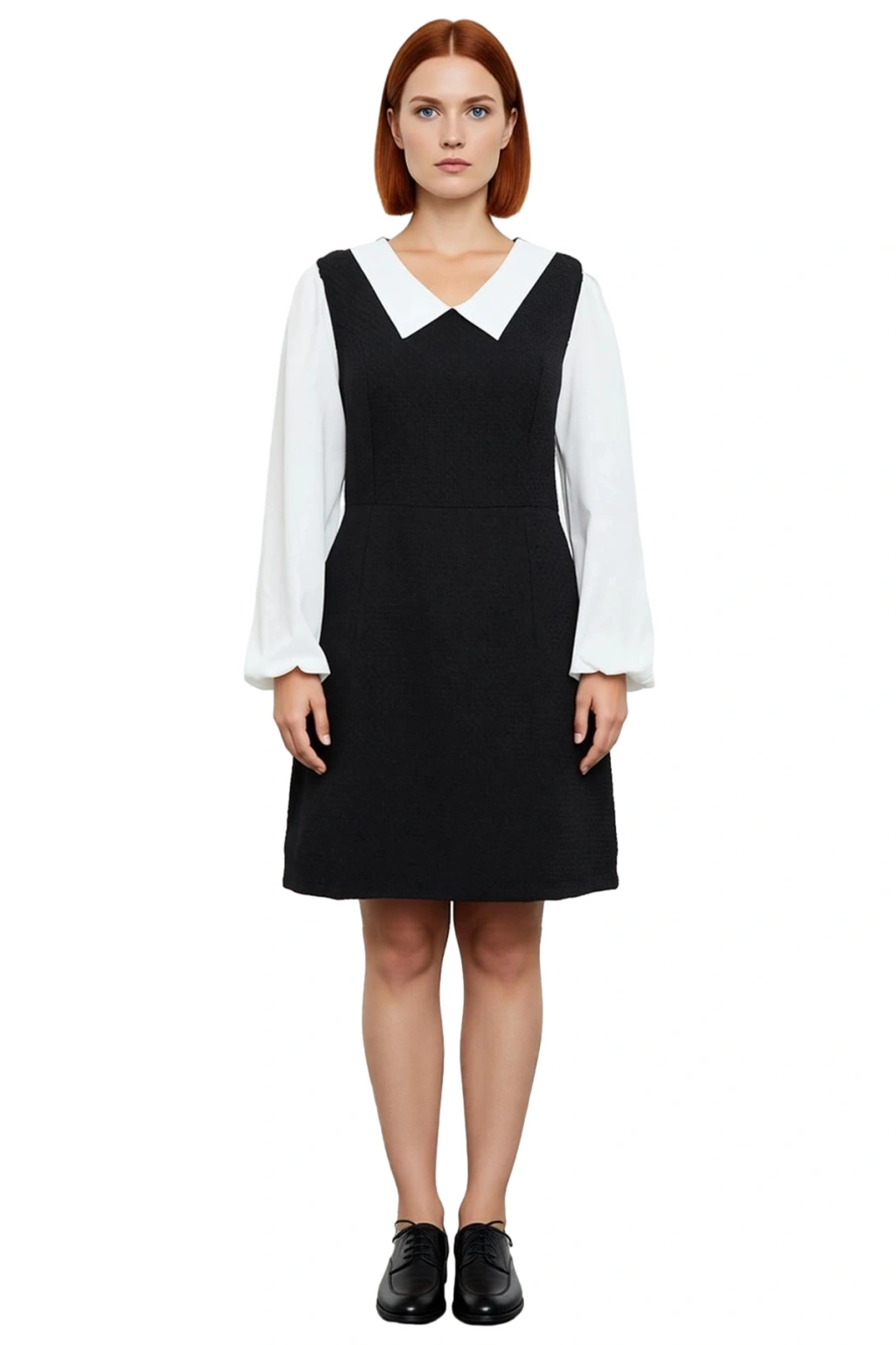 Casual şıklığın yeni tanımı olan bu kadın A-line elbise, modern tasarımıyla dikkat çekiyor. Yüksek kaliteli tüvit dokuma kumaşı, %49 pamuk, %28 polyester, %18 viskoz ve %5 akrilik materyal bileşeni sayesinde hem yumuşak bir dokunuş hem de üstün bir konfor sunar. Siyah ana rengi, zarif beyaz gömlek yaka ve uzun kollarla birleşerek çarpıcı bir renk bloklu desen oluşturur. Bu özel tasarım, günlük kullanımda dahi sofistike bir hava yakalamak isteyen kadınlar için biçilmiş kaftan. Astarsız yapısı sayesinde hafif ve nefes alabilir bir deneyim sunar.