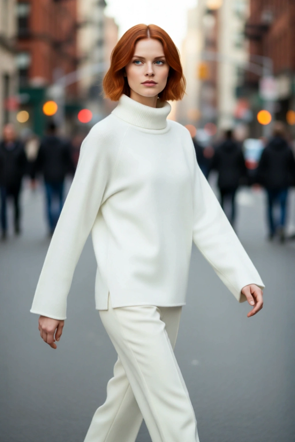 Ürün Özellikleri: Oversize kalıp, akrilik ve polyester materyal, düz desen, balıkçı yaka, reglan kol, triko kumaş, ekru renk, baskısız tasarım.