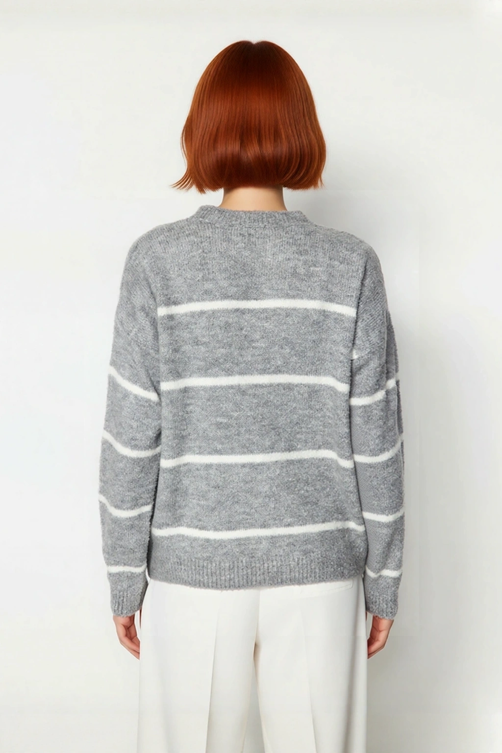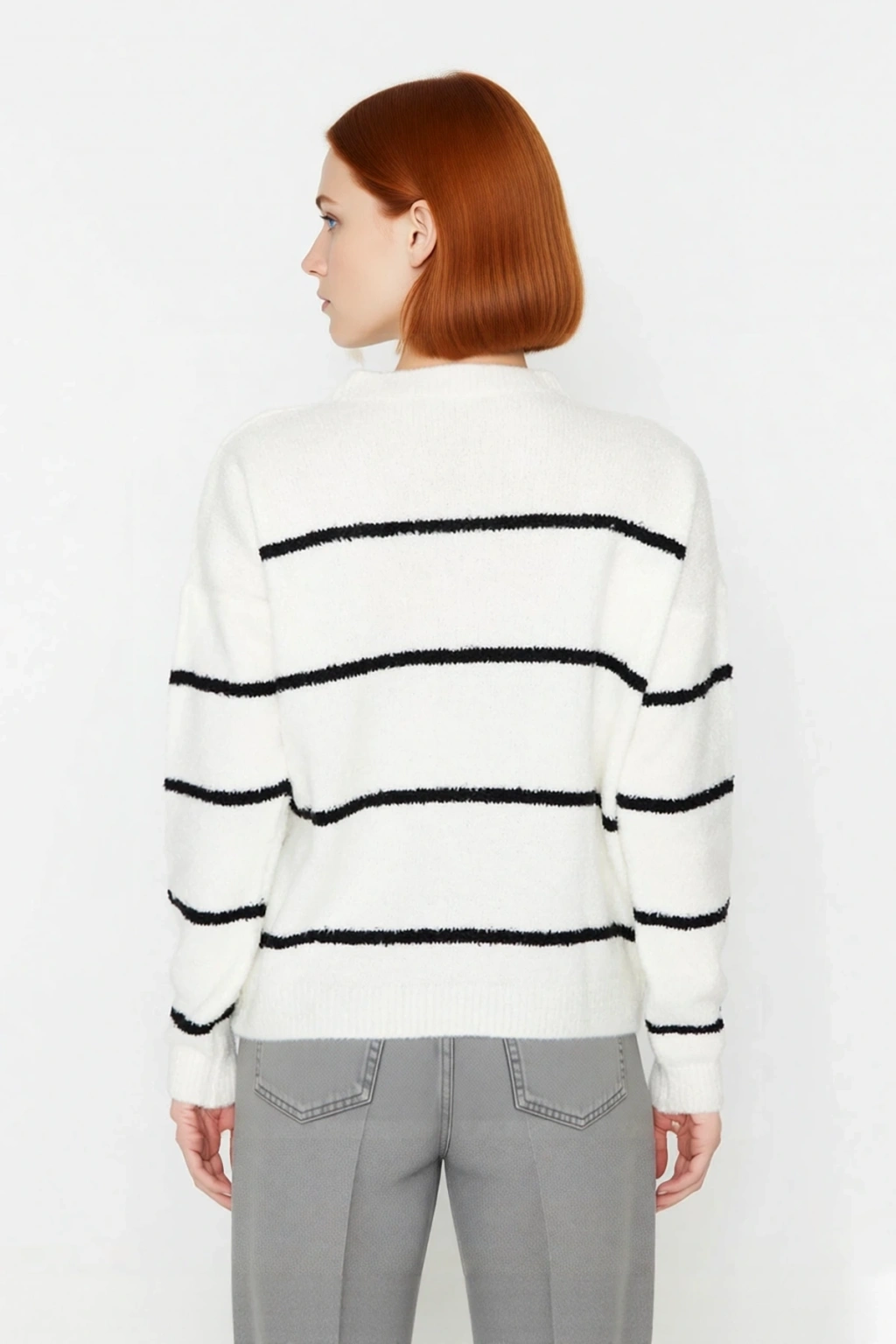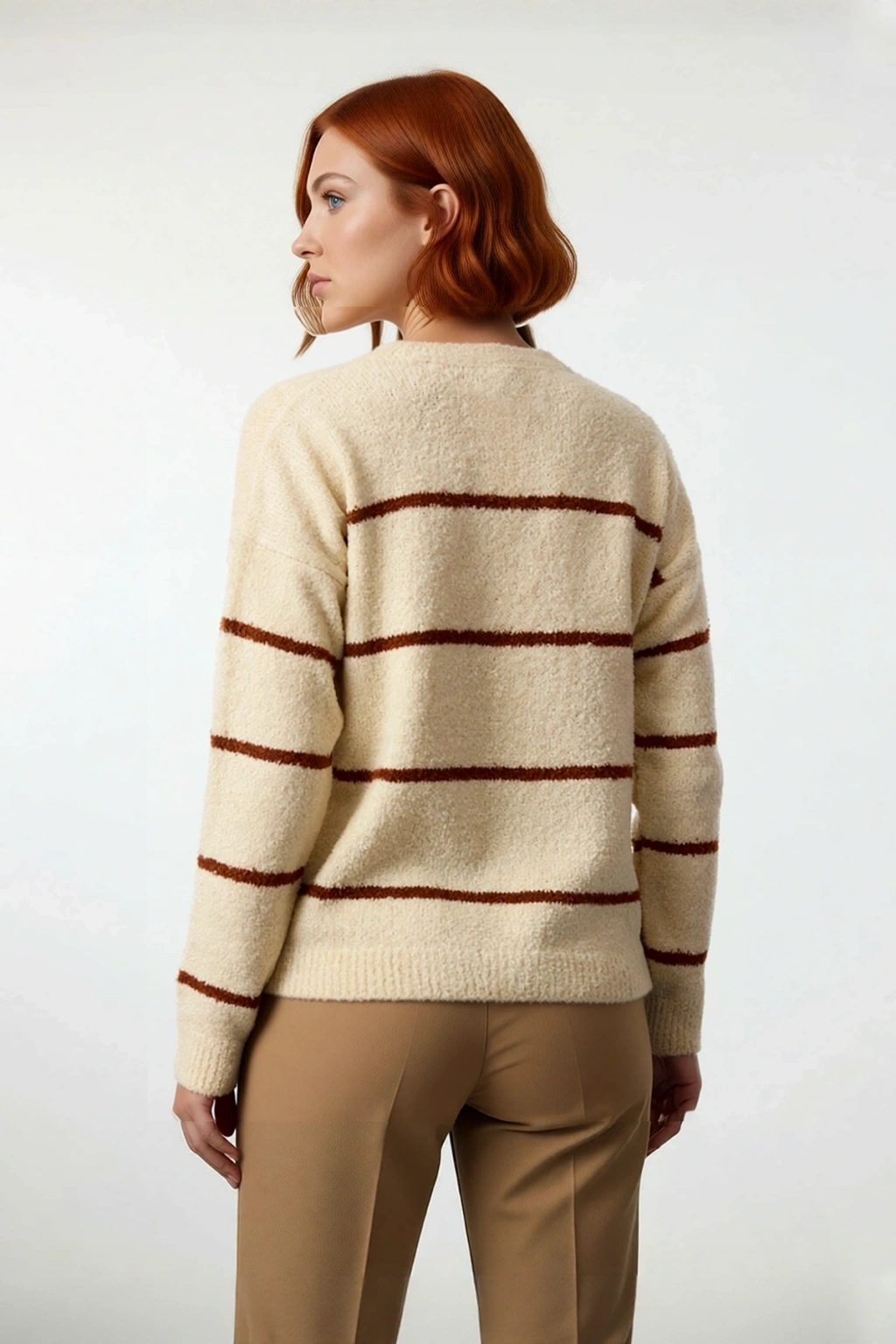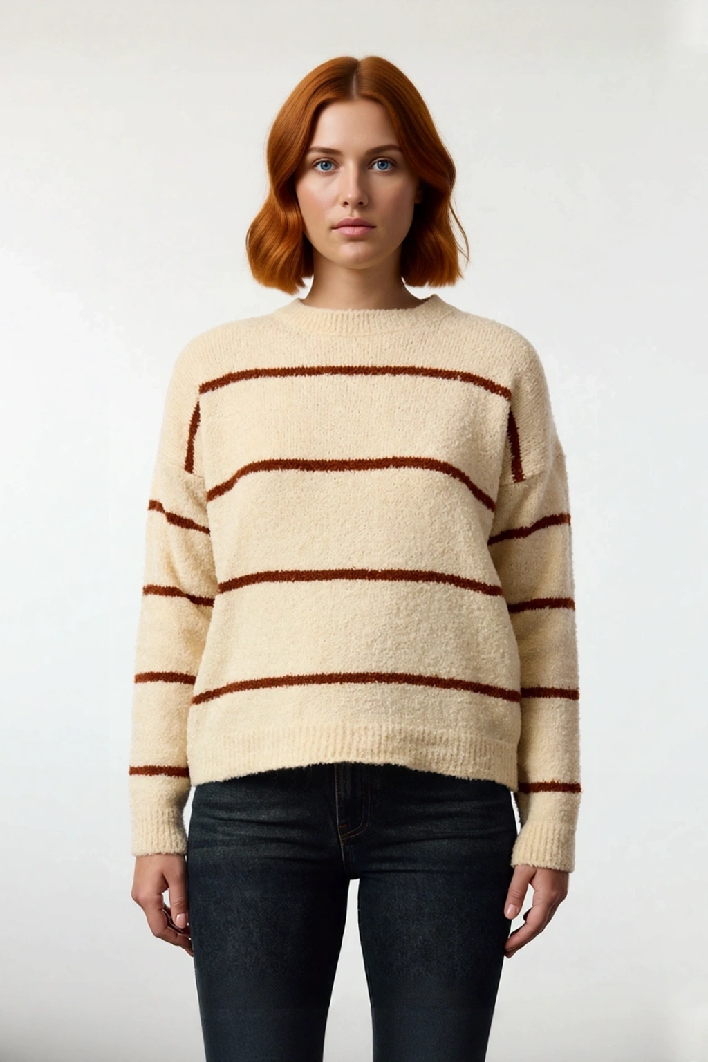 Ürün Özellikleri: Geniş kalıp, 73% akrilik 27% polyester materyal, çizgili desen, bisiklet yaka, düşük kol, triko kumaş, ekru renk.