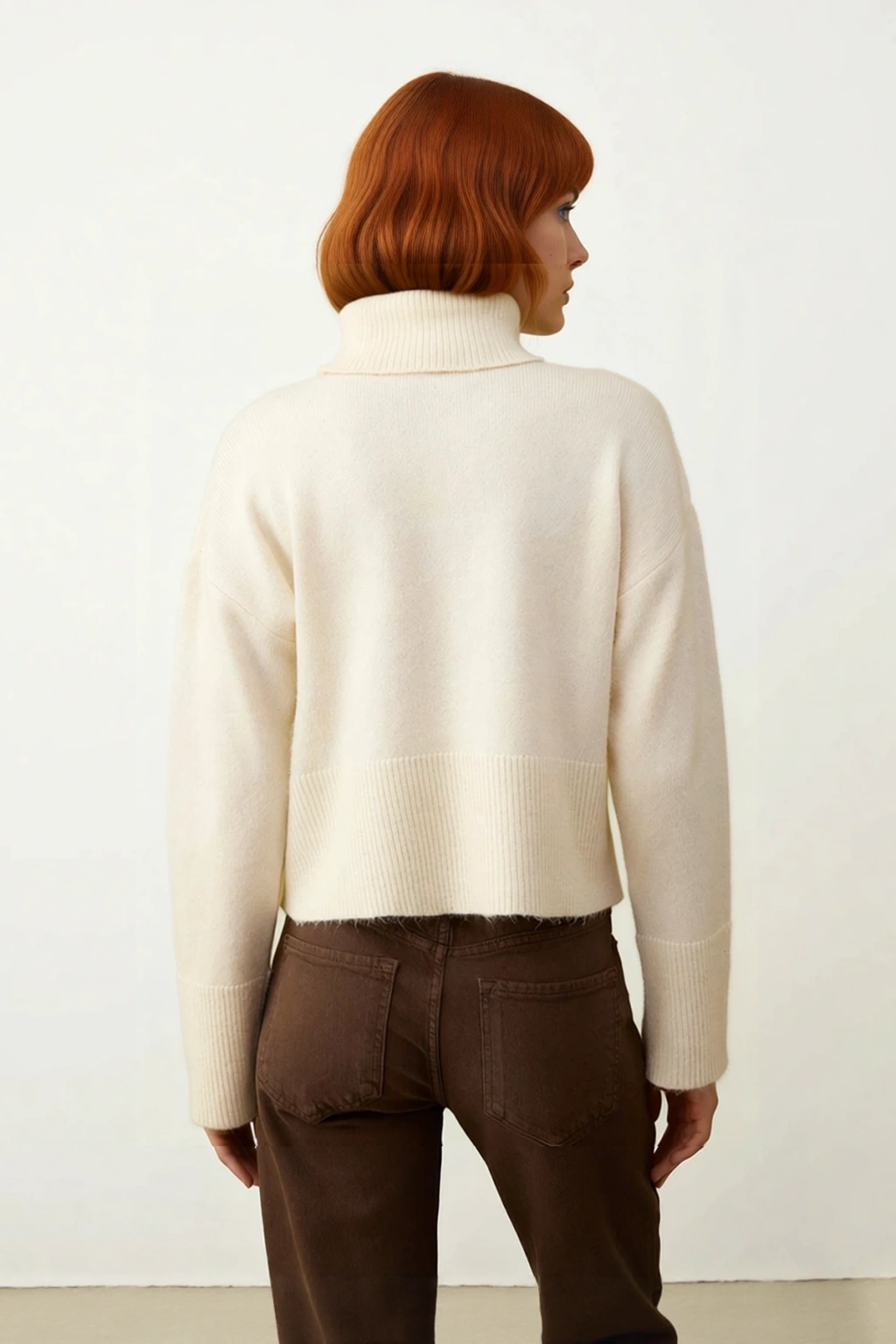Kazanın dik yaka tasarımı, soğuk hava koşullarına karşı ekstra koruma sağlarken, aynı zamanda stilinize sofistike bir dokunuş katar. Standart kol yapısı, klasik bir rahatlık sunarak hareket kabiliyetinizi kısıtlamaz. Orta kalınlıkta triko kumaşı, tek plaka dokuma tekniğiyle üretilmiş olup dayanıklılığı ve uzun ömürlü kullanımı garanti eder. Uzun kol boyu soğuk günlerde ekstra sıcaklık sunarken, crop boy kesimi modern bir siluet oluşturur ve farklı kombinasyonlara imkan tanır. Bakımı oldukça kolay olan bu kazak, T41 yıkama talimatına uygun olarak makinede yıkanabilir, böylece pratik kullanım sunar.
