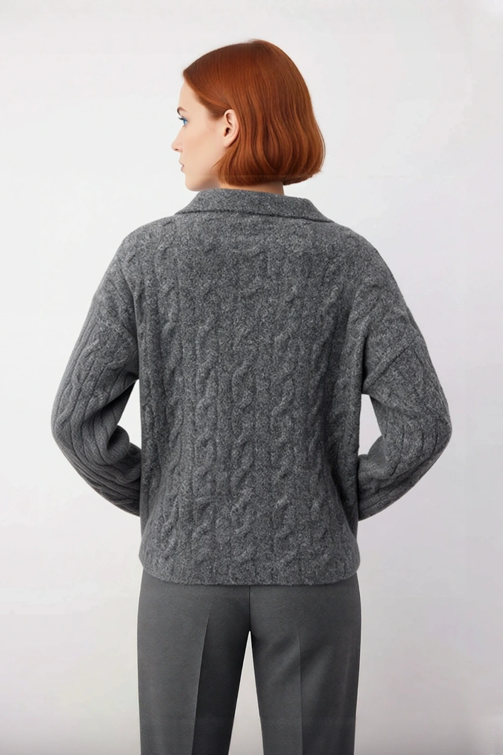 Ürün Özellikleri: Oversize kalıp, karışım materyal, saç örgü desen, apaş yaka, düşük kol, triko kumaş, gri renk.