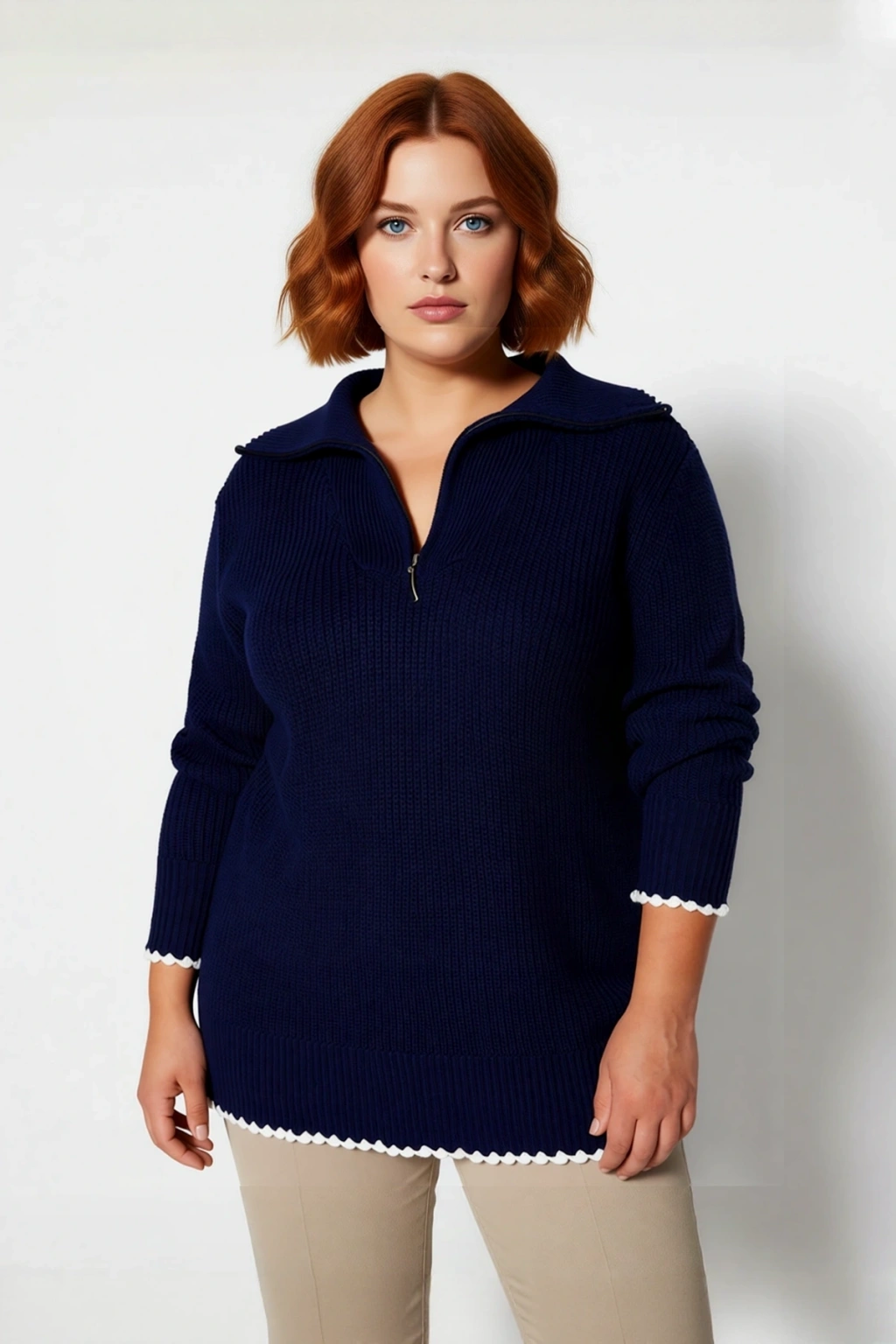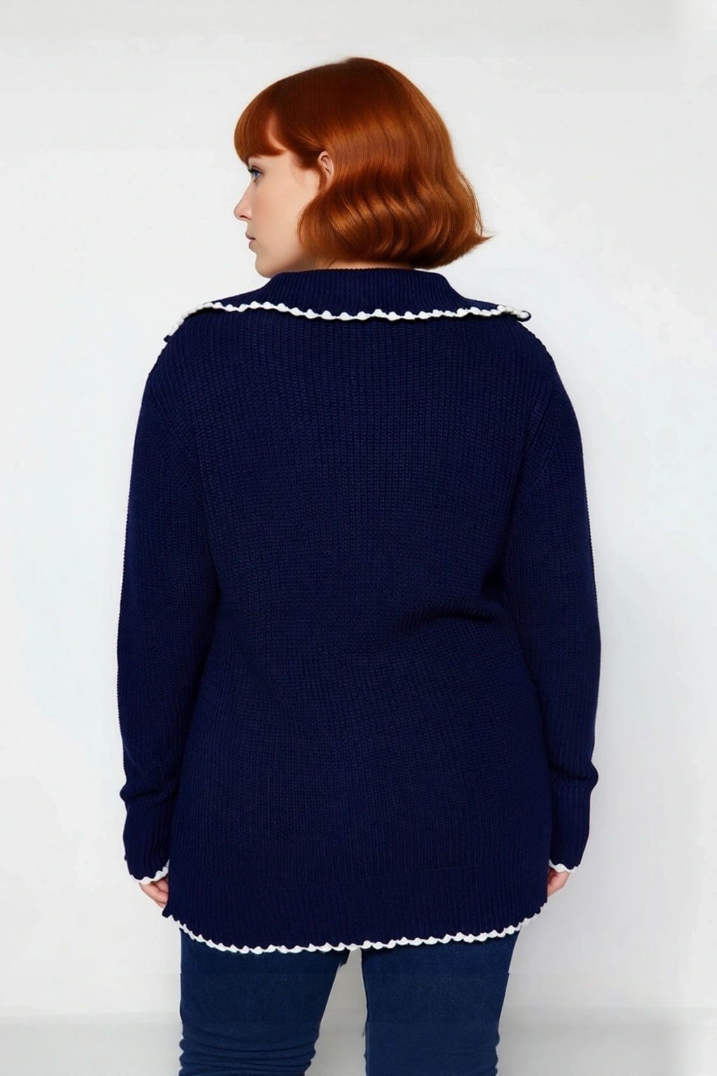 Ürün Özellikleri: Relaxed kalıp, akrilik materyal, düz desen, dik yaka, düşük kol, triko kumaş, lacivert renk, baskısız tasarım.