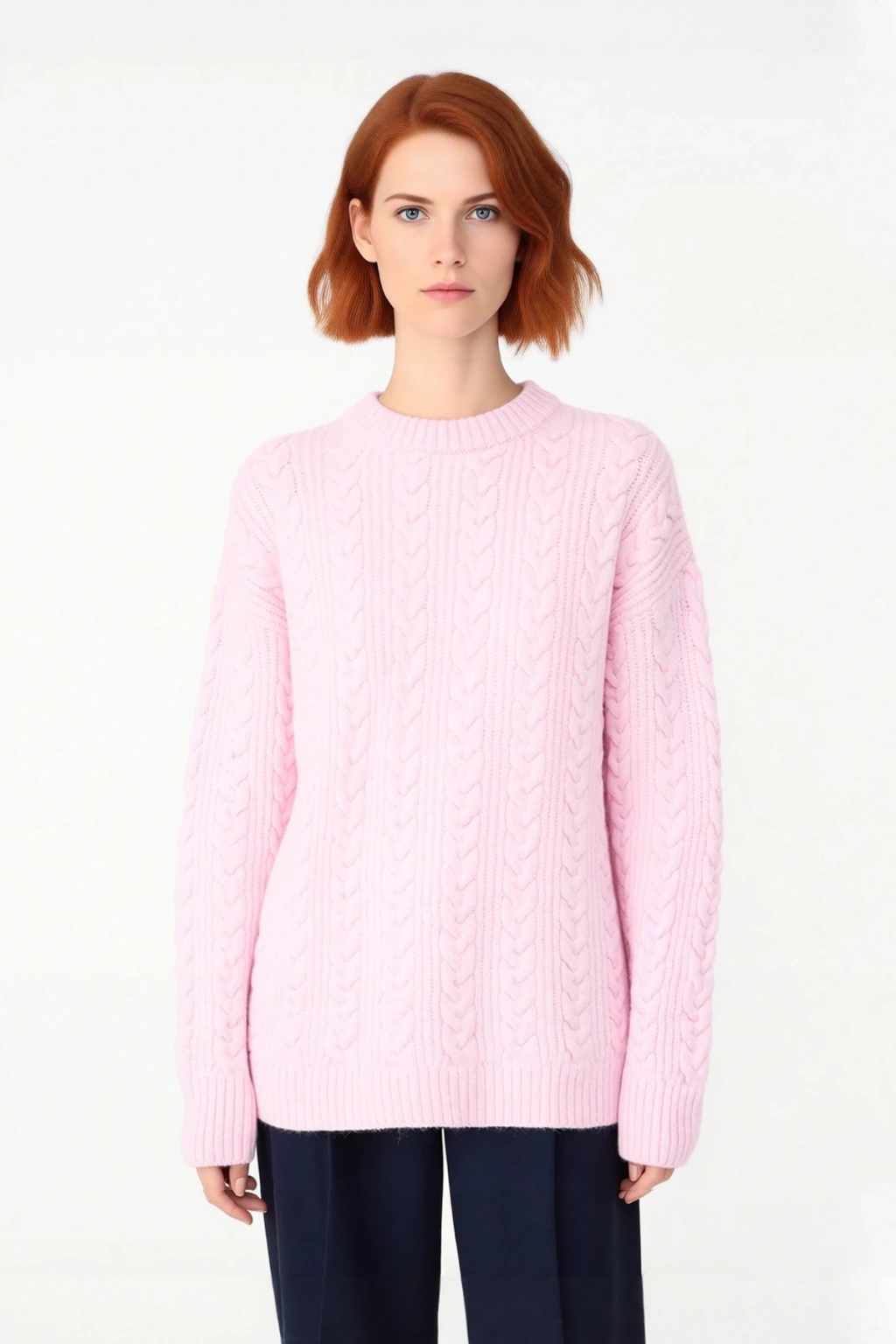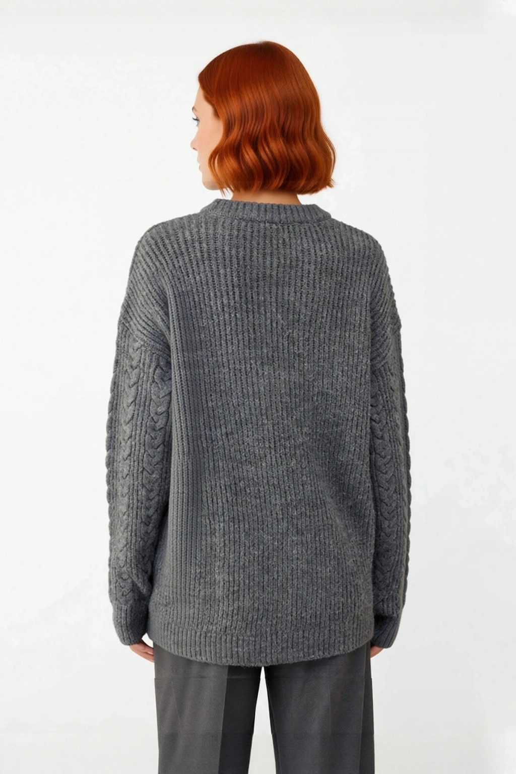 Ürün Özellikleri: Oversize kalıp, akrilik karışımlı materyal, saç örgü desen, bisiklet yaka, düşük kol, triko kumaş, gri renk.