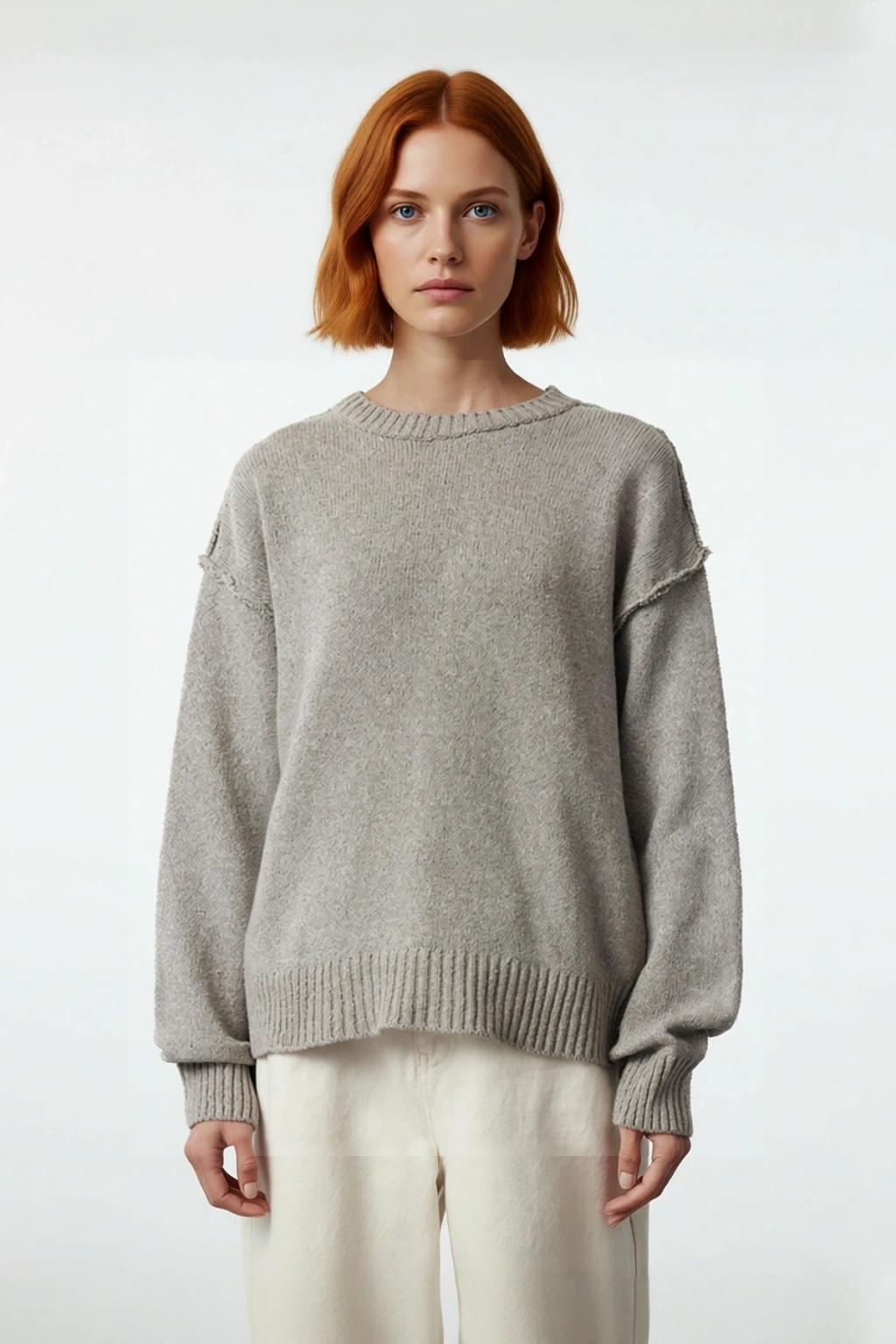 Ürün Özellikleri: Oversize kalıp, polyester karışımlı materyal, düz desen, bisiklet yaka, standart kol, triko kumaş, bej renk.