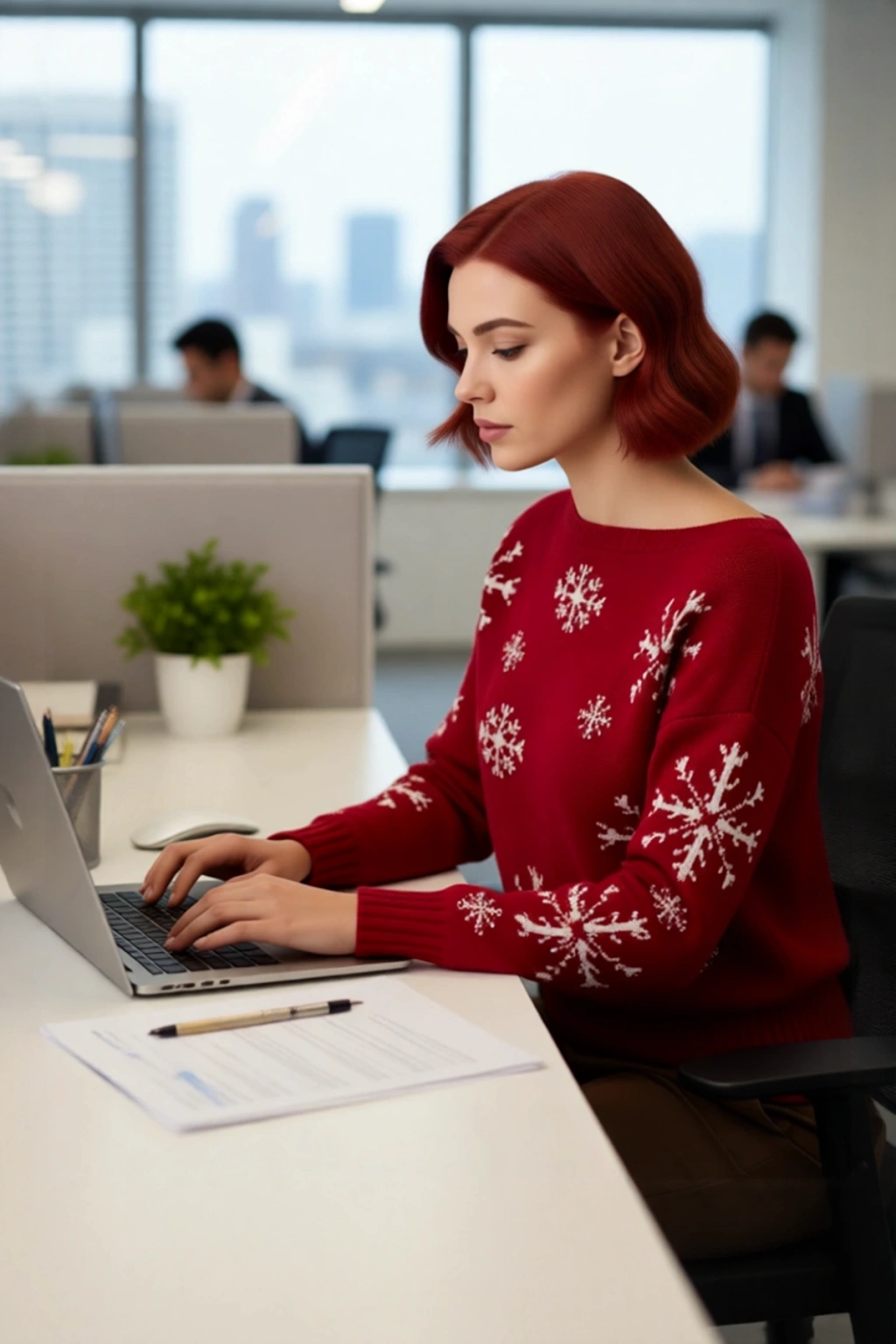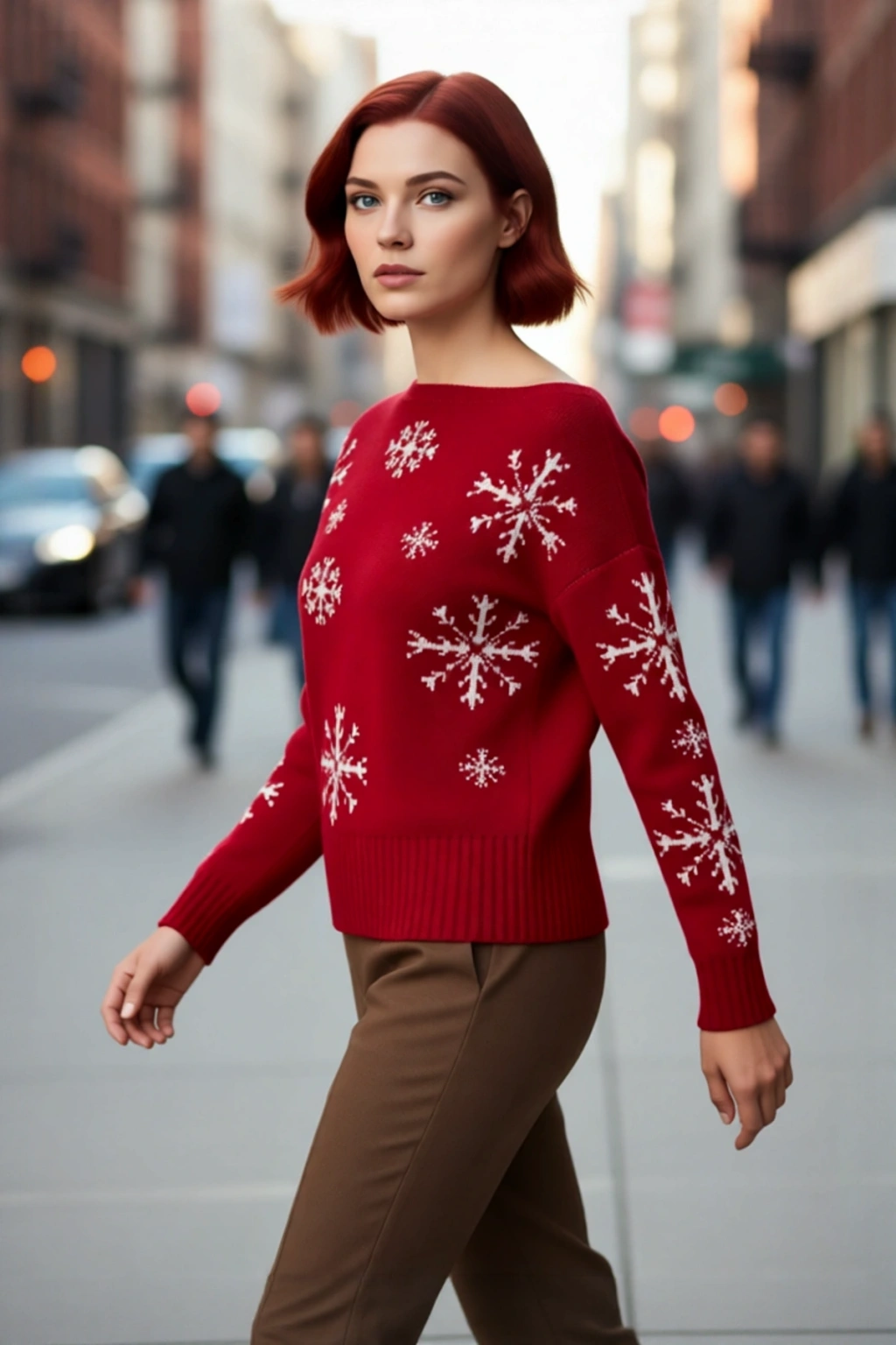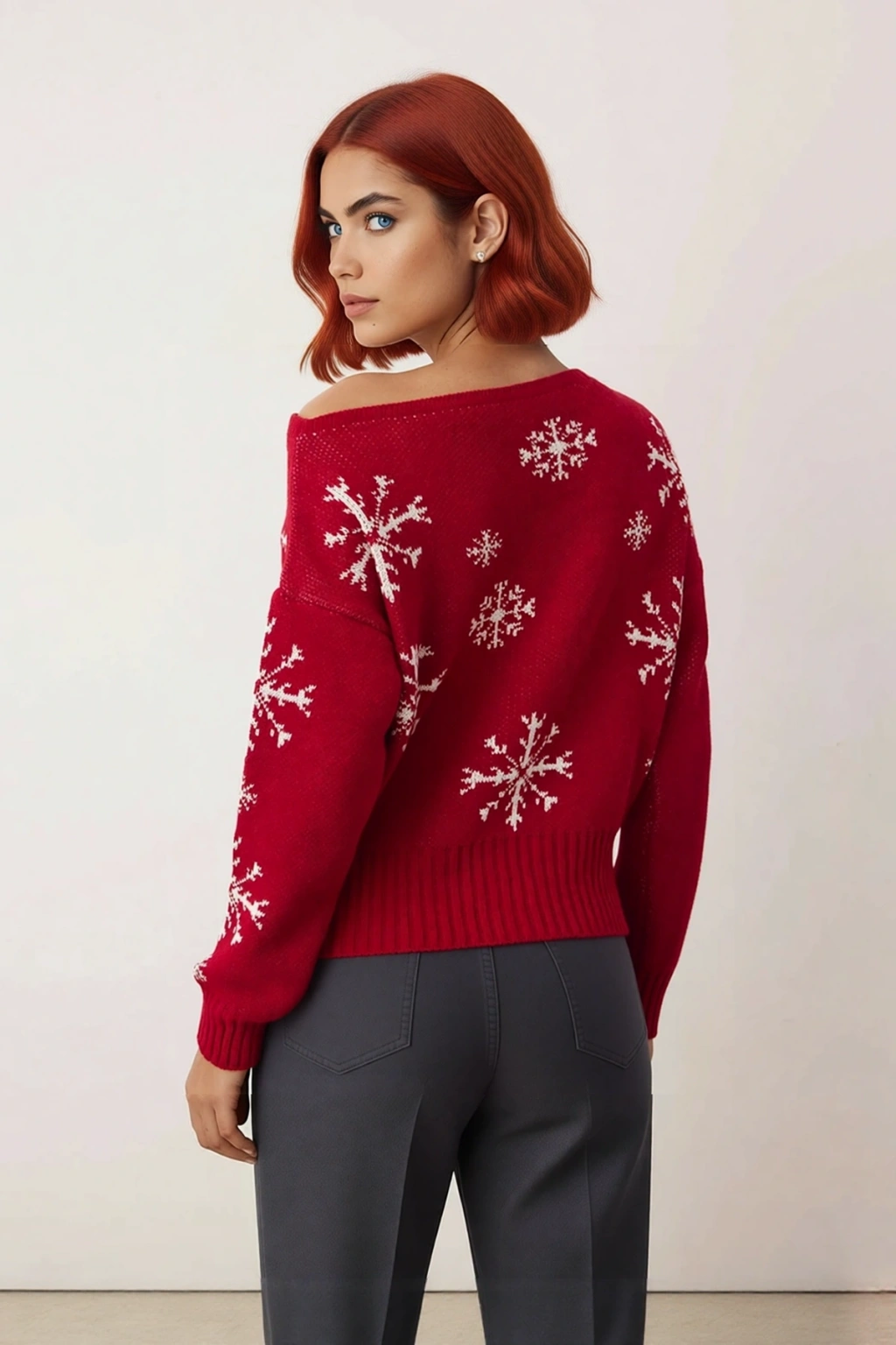 Ürün Özellikleri: Oversize kalıp, akrilik materyal, yılbaşı desen, kayık yaka, standart kol, triko kumaş, kırmızı renk.