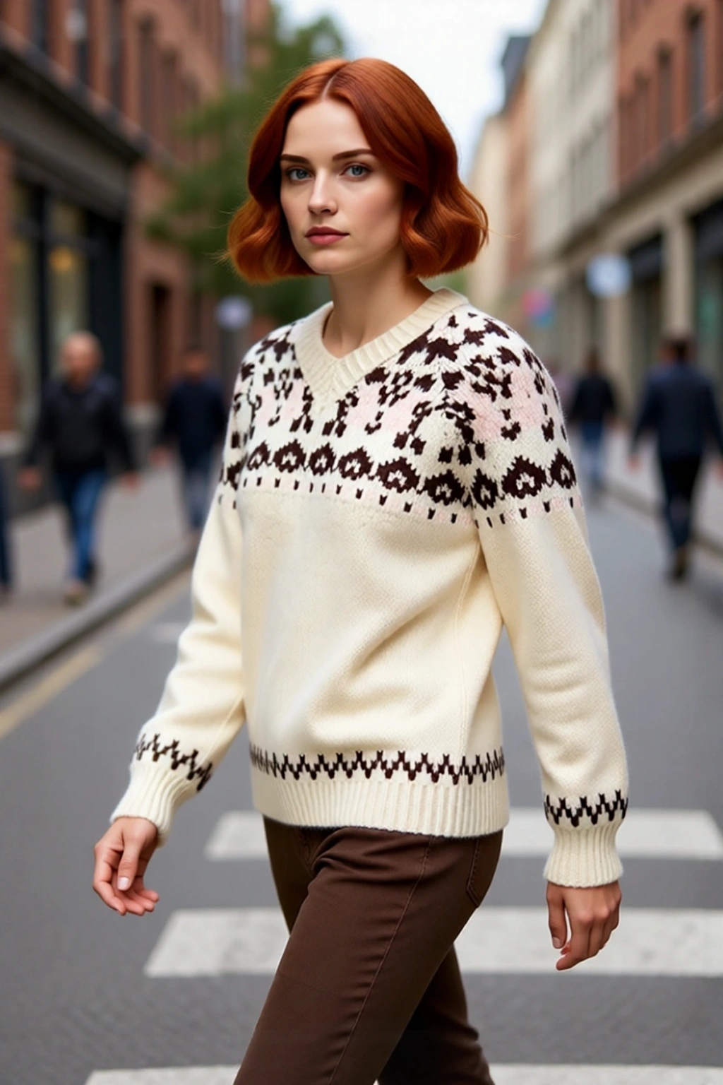Ürün Özellikleri: Oversize kalıp, akrilik polyester materyal, etnik desen, V yaka, reglan kol, triko kumaş, bej renk.