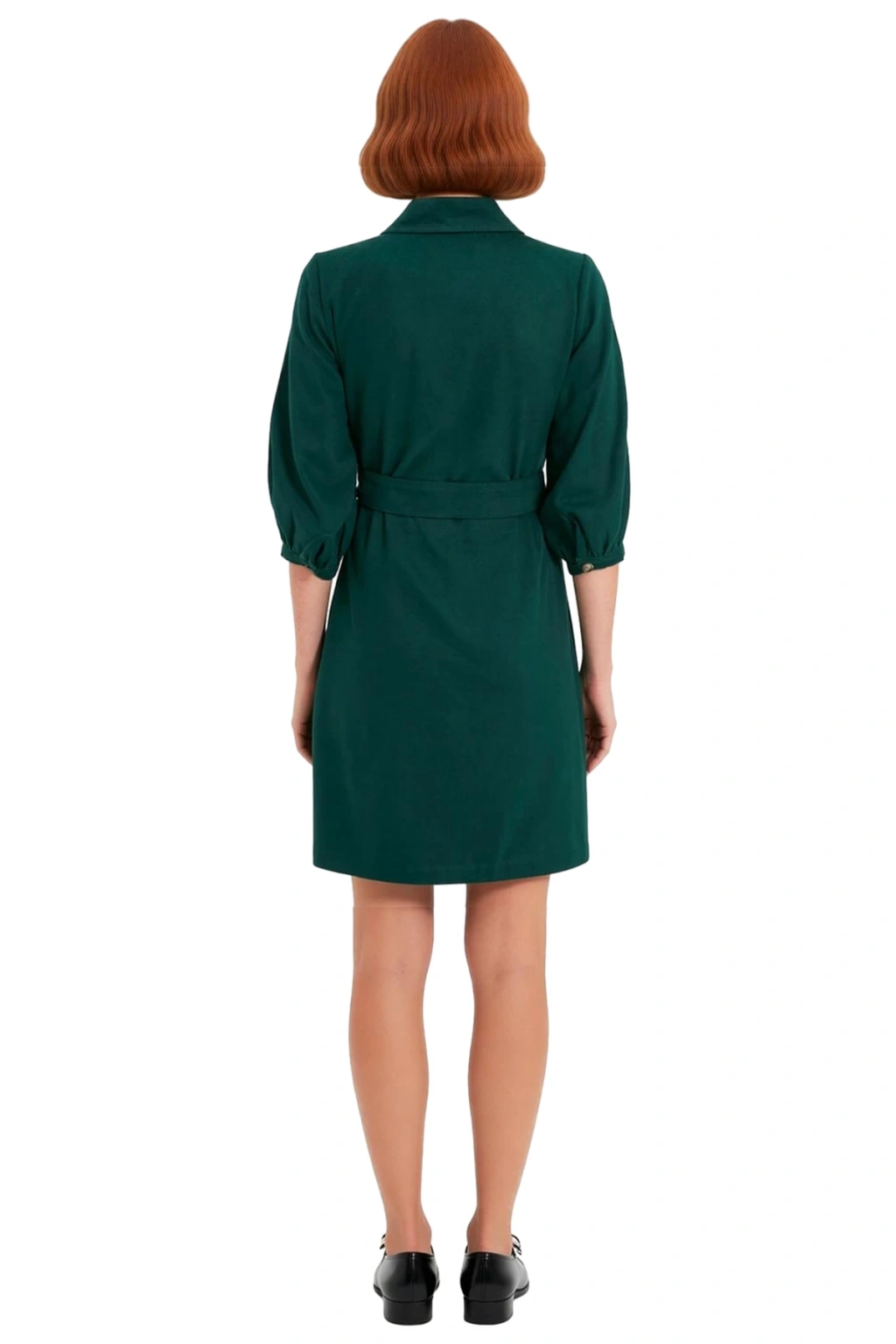 Gömlek yaka tasarımı, elbiseye sofistike bir hava katarken, tam boy düğme kapama detayı fonksiyonellik ve estetiği birleştirir. Truvakar balon kol yapısı, modern ve feminen bir dokunuş eklerken, rahat hareket imkanı sunar. Kısa boyu ile enerjik ve genç bir tarz yansıtan bu elbise, belindeki ahşap tokalı kemerle siluetinizi vurgular. Göğüs ve etek kısmında yer alan kullanışlı cepler, hem pratik depolama alanı sunar hem de elbiseye dinamik bir detay katar. Astarsız olması sayesinde hafiflik sunarken, gabardin kumaş yapısı sayesinde dört mevsim geçişlerinde kullanıma uygundur.
