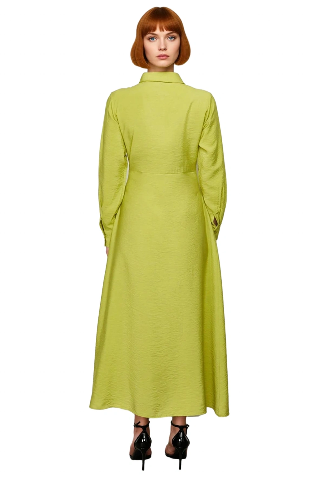 Ürün Özellikleri: A-line kalıp, viskoz poliamid materyal, düz desen, gömlek yaka, standart kol, dokuma kumaş, yeşil renk.