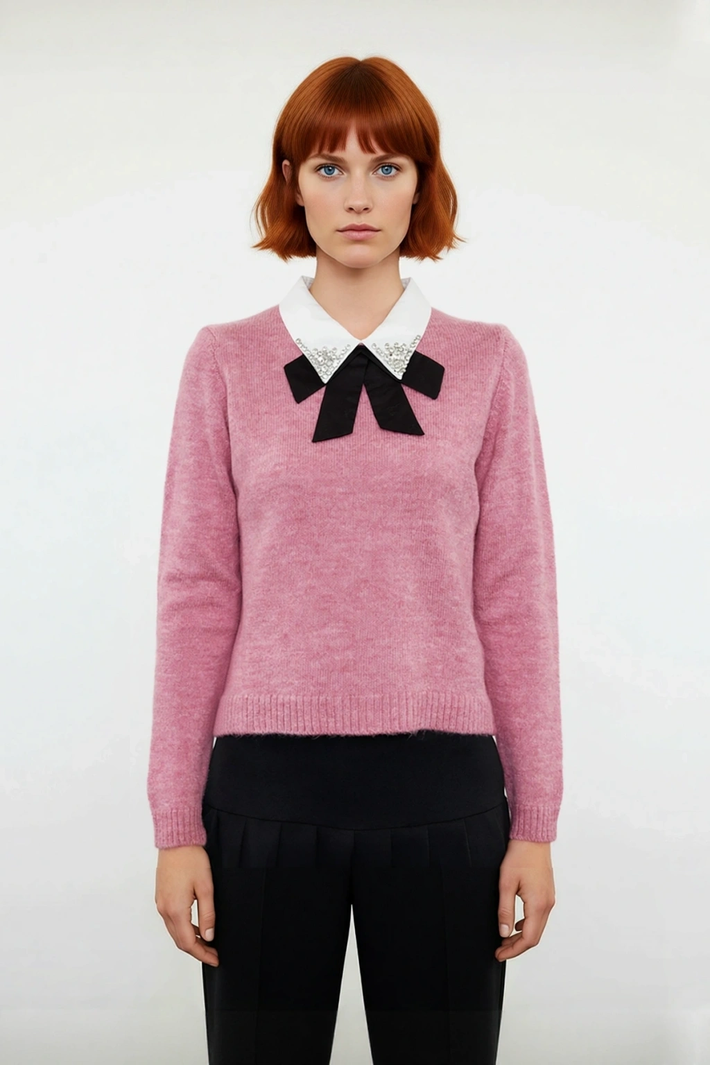 Kadınlar için tasarlanan bu göz alıcı triko kazak, regular kalıbı ile modern ve rahat bir duruş sergiler. Yumuşacık dokusuyla cildinizi şımartan akrilik karışımlı materyali, soğuk havalarda ideal sıcaklığı ve üstün konforu sunar. Antrasit rengi, zarif gömlek yaka görünümüyle birleşerek klasik ve çağdaş bir sentez oluşturur. Yaka üzerindeki ışıltılı taş detayları ve dikkat çekici kurdele fiyonk, bu kazağı sıradan olmaktan çıkarıp, her ortamda fark edilmenizi sağlayacak özel bir parçaya dönüştürür.