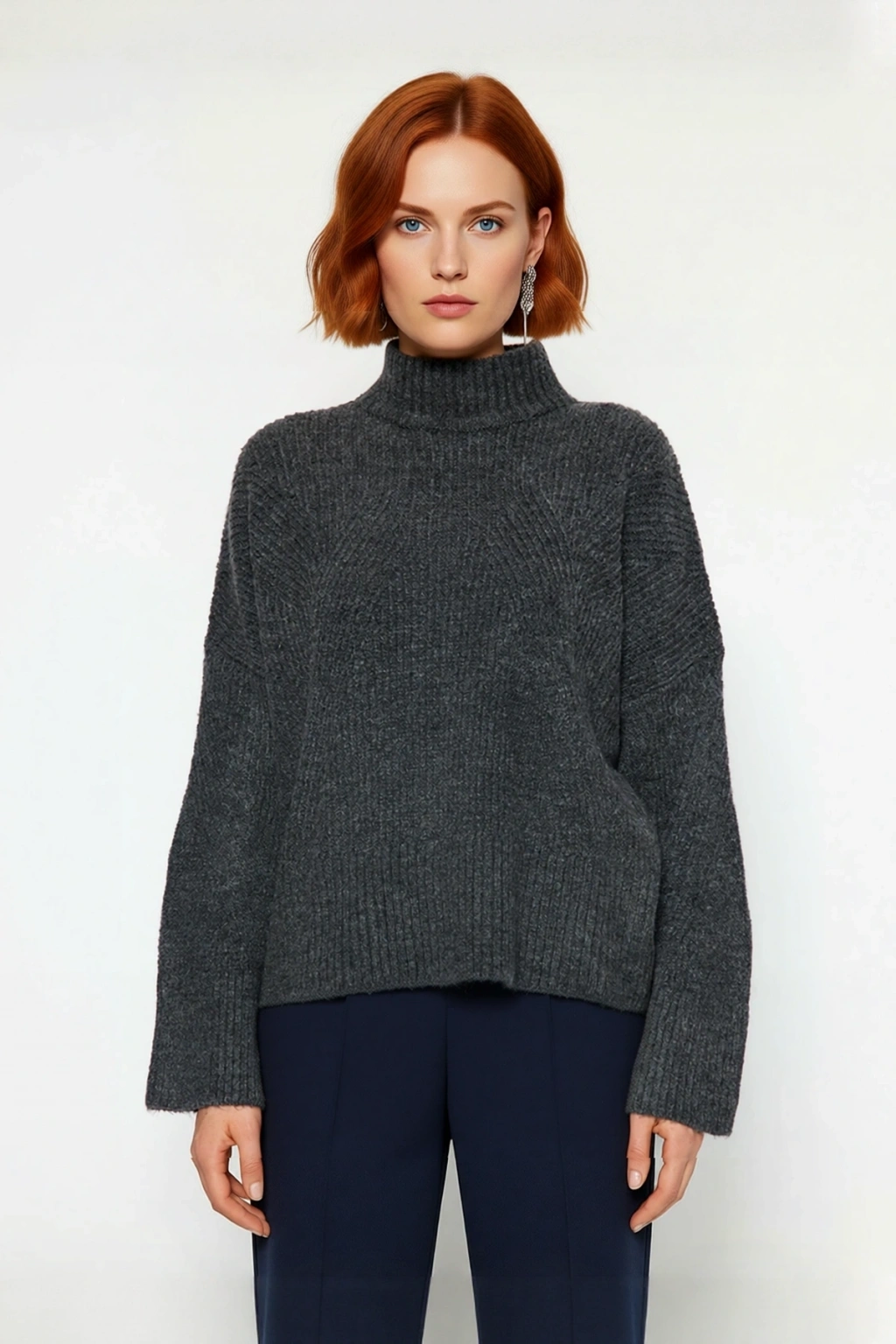 Ürün Özellikleri: Oversize kalıp, akrilik materyal, düz desen, dik yaka, reglan kol, triko kumaş, gri renk, baskısız tasarım.