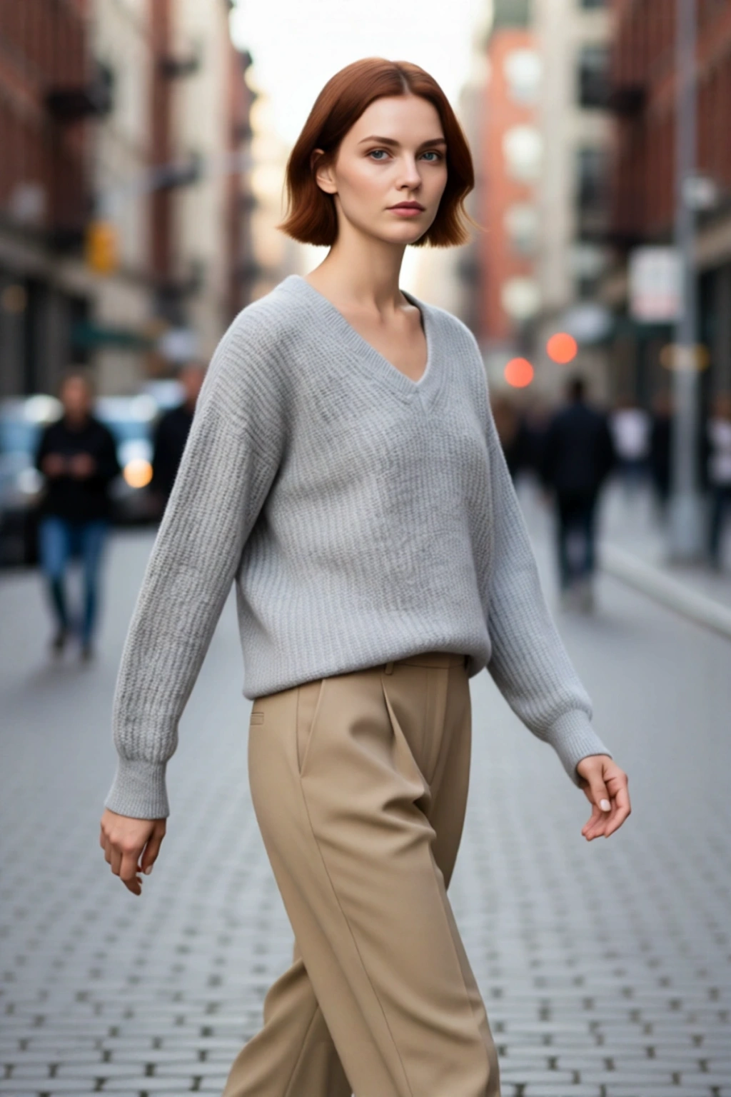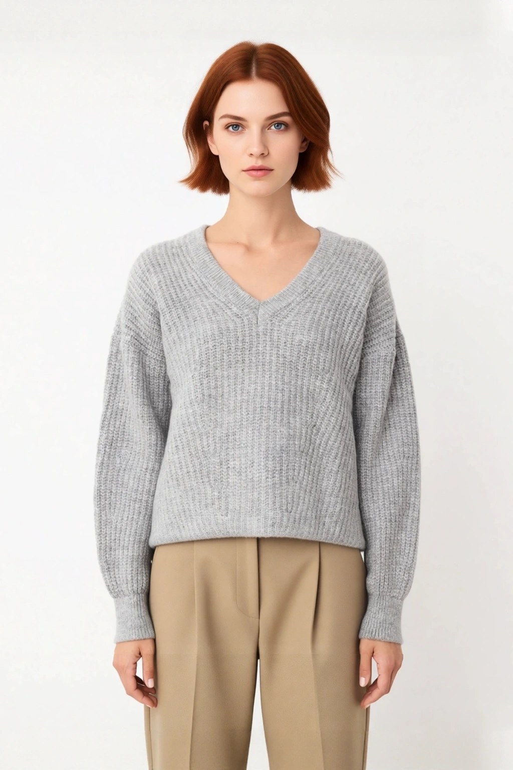Ürün Özellikleri: Oversize kalıp, akrilik polyester elastan karışımı materyal, düz desen, V yaka, düşük kol, triko kumaş, gri renk, orta kalınlık.