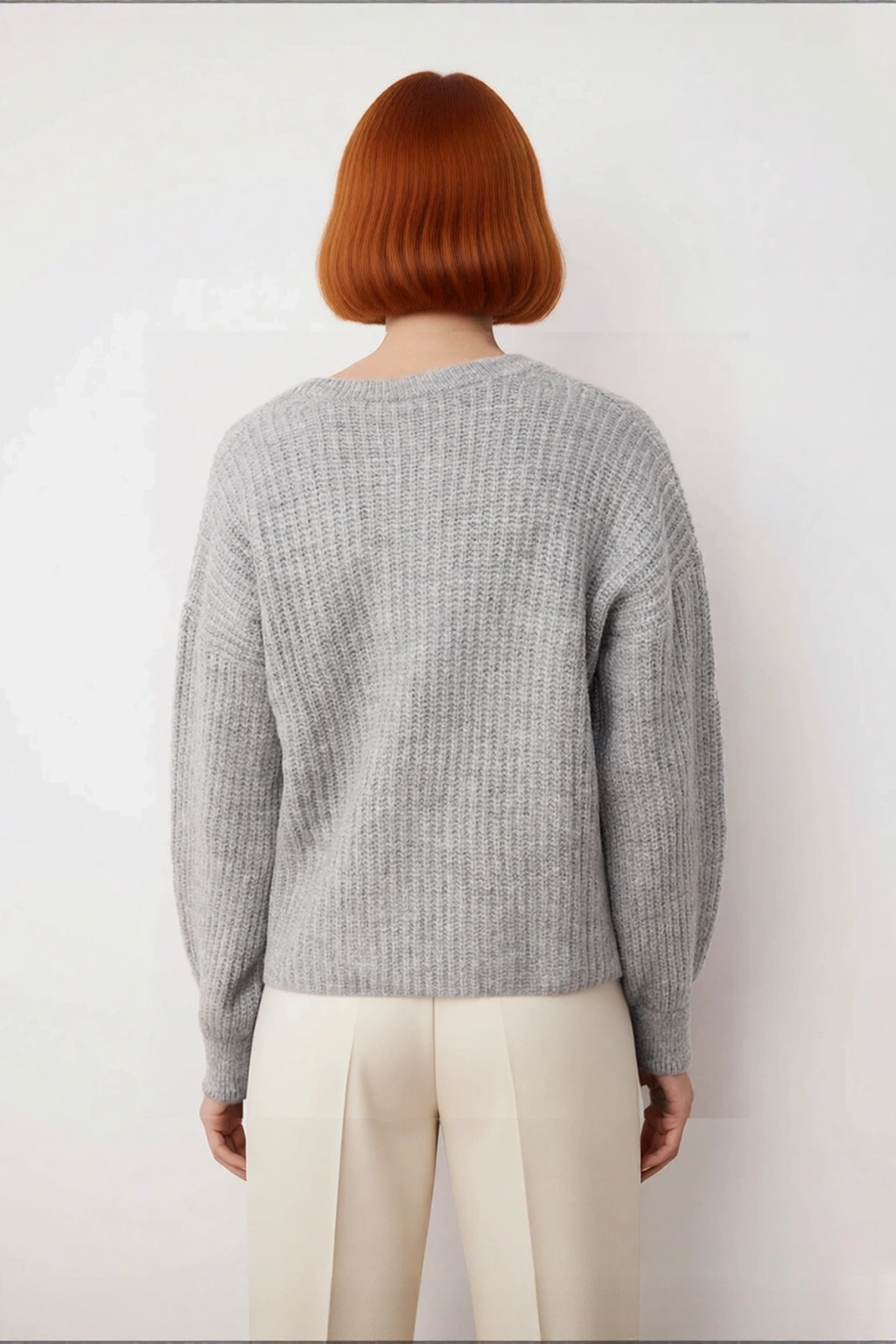 Ürün Özellikleri: Oversize kalıp, akrilik polyester elastan karışımı materyal, düz desen, V yaka, düşük kol, triko kumaş, gri renk, orta kalınlık.