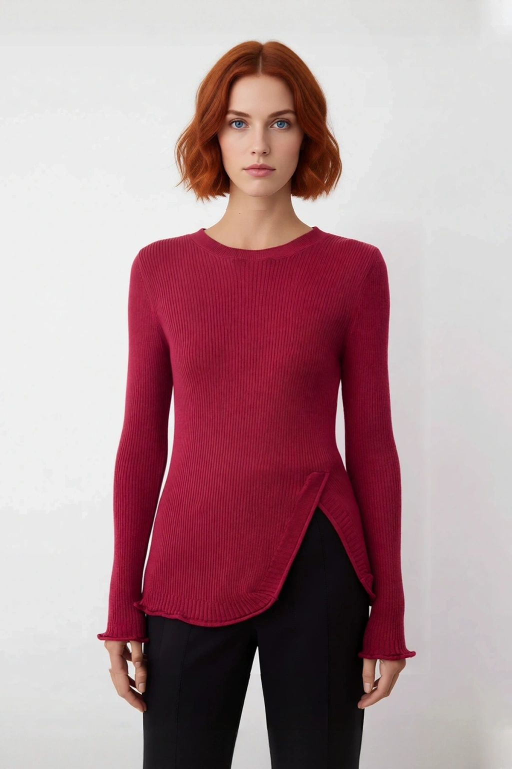 Bu Kadın Gül Kurusu Fitted Yırtmaç Detaylı Bisiklet Yaka İnce Triko Kazak, modern tasarımı ve sofistike gül kurusu rengiyle gardırobunuzun vazgeçilmezi olmaya aday. Vücudu saran fitted kalıbı sayesinde zarif bir siluet oluştururken, asimetrik yırtmaç detayı ürüne özgün ve dinamik bir hava katıyor. Yüksek kaliteli viskoz ve akrilik materyal karışımıyla üretilen bu kazak, düz deseni ve baskısız yüzeyi ile sade ve şık bir görünüm sunar. Casual/günlük kullanım için ideal olup, konfor ve estetiği bir arada arayan kadınlar için tasarlandı.