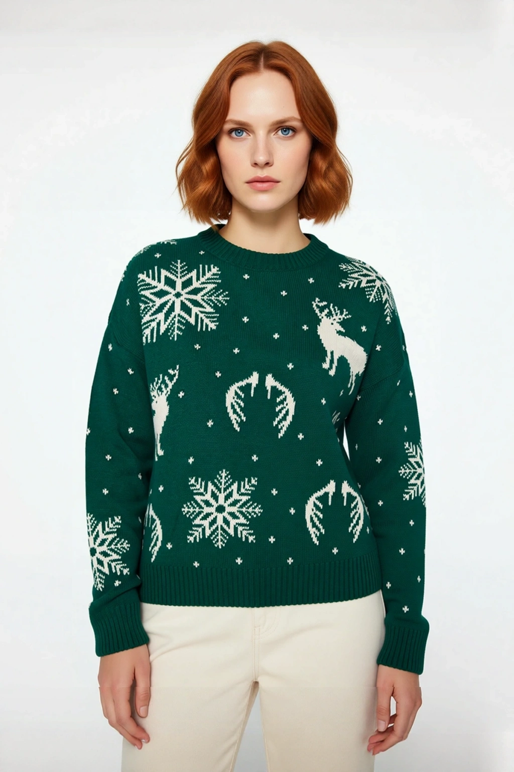 Ürün Özellikleri: Oversize kalıp, 100% Akrilik materyal, Yılbaşı desen, Bisiklet yaka, Düşük kol, Triko kumaş, Yeşil renk.