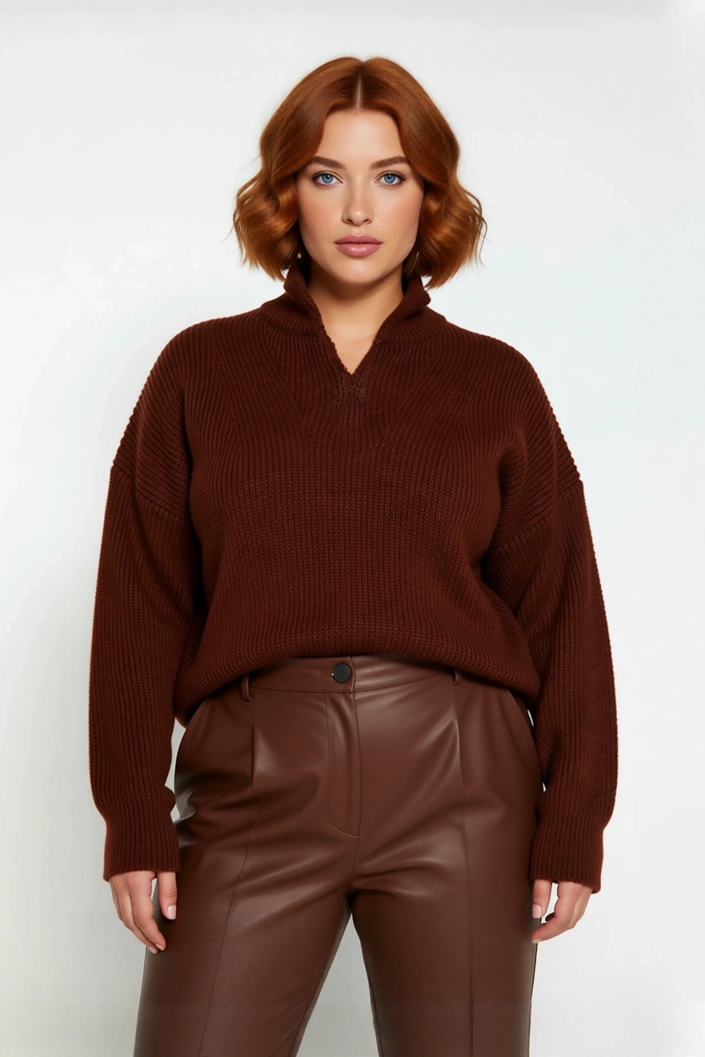Ürün Özellikleri: Relaxed kalıp, %100 akrilik materyal, düz desen, dik yaka fermuarlı, standart uzun kol, triko kumaş, kahverengi renk, regular boy.