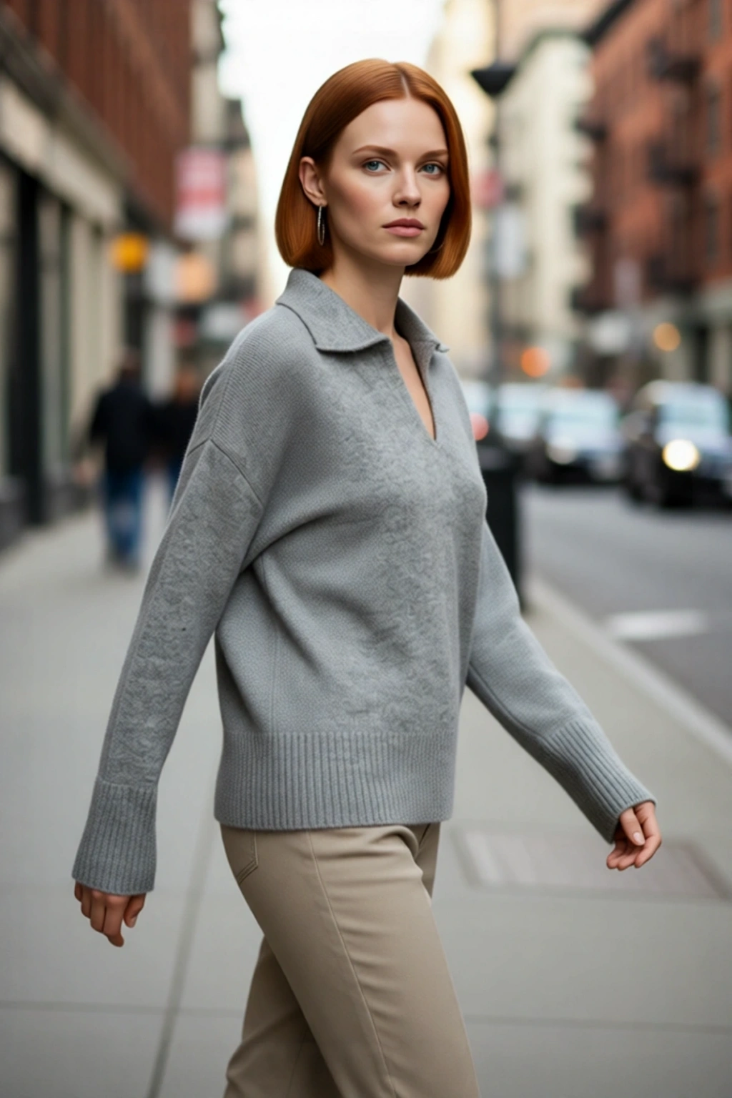 Ürün Özellikleri: Oversize kalıp, akrilik polyester yün materyal, düz desen, polo yaka, düşük kol, triko kumaş, ekru renk, baskısız tasarım.