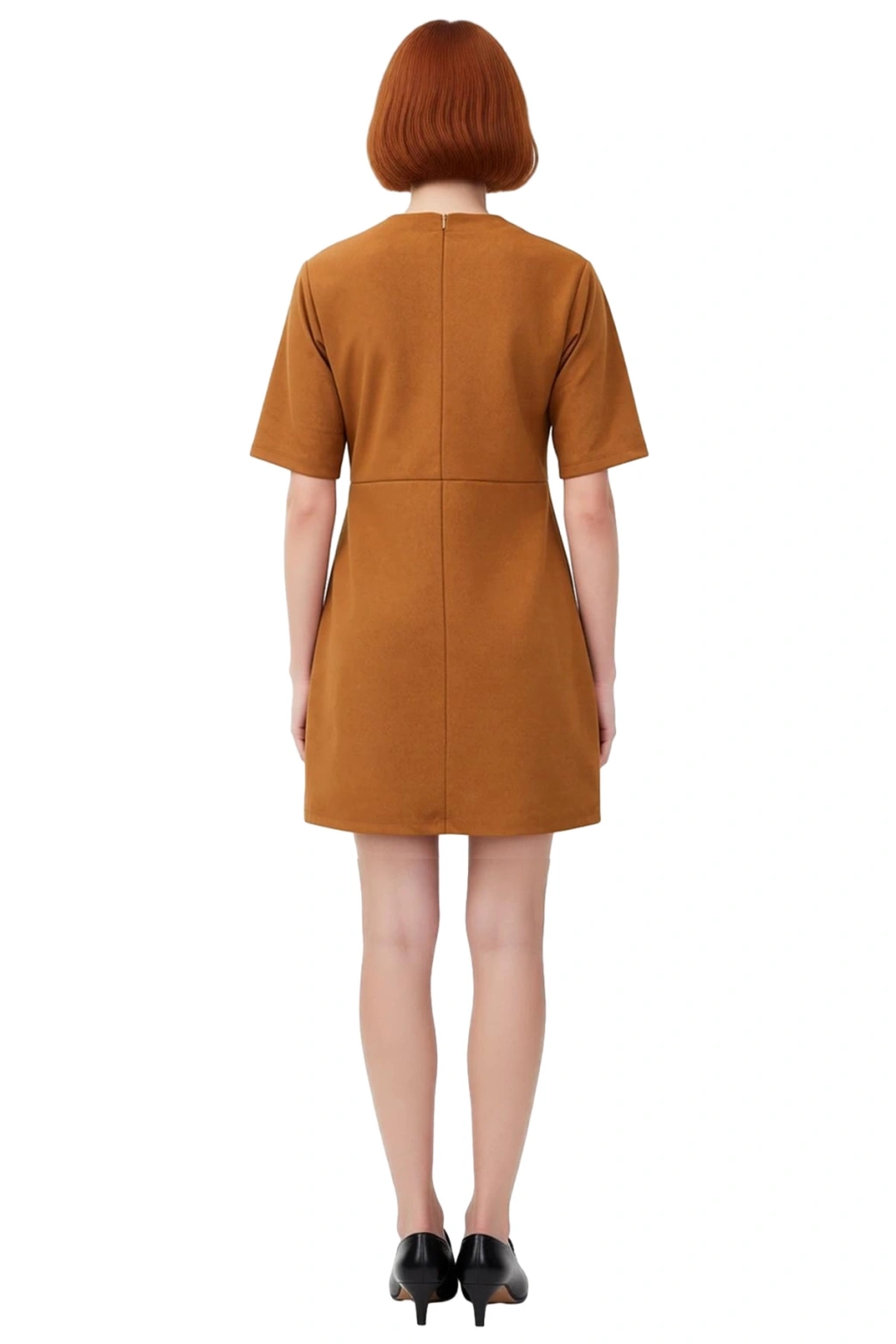 Kadınlar için tasarlanan bu düz desen kısa kollu mini elbise, günlük şıklığınızı zahmetsizce tamamlar. Rahat A-line kalıbı sayesinde vücuda oturmayan, salaş ve modern bir görünüm sunar. Yüksek kaliteli polyester-elastan karışımı materyali, süet dokusuyla hem yumuşak bir his verir hem de esneklik sağlayarak hareket özgürlüğünüzü destekler. Ön kısmındaki dikkat çekici bağlama detayları ve kuşgözü aksesuarları, elbiseye benzersiz bir karakter katarken, kahverengi tonu ile doğal ve sıcak bir stil yaratır.