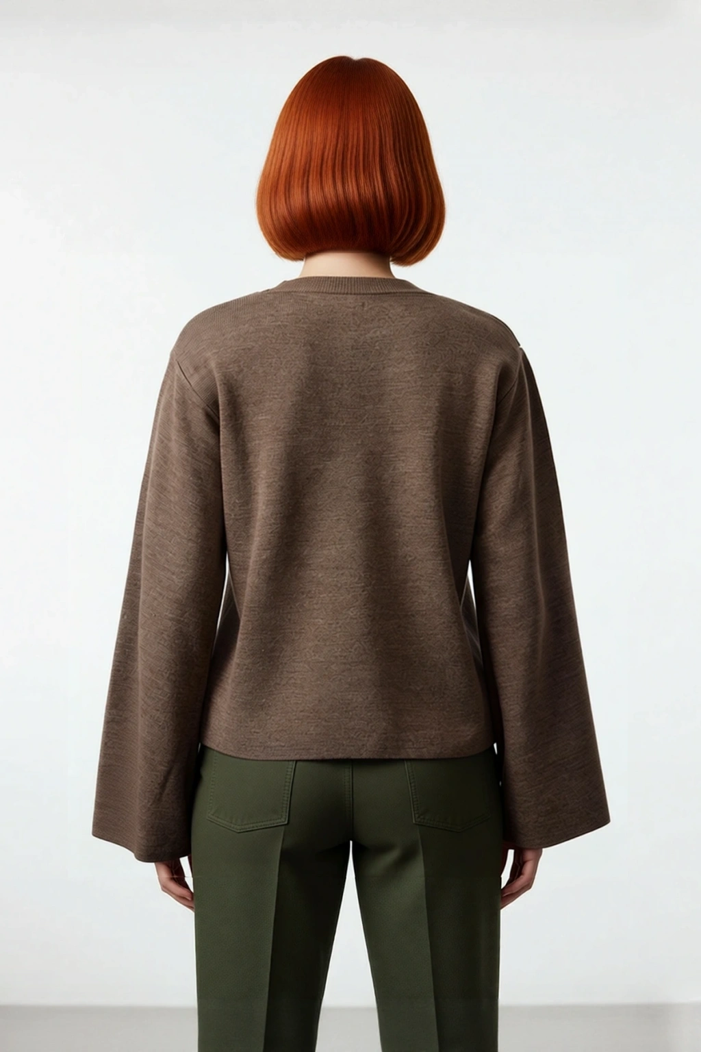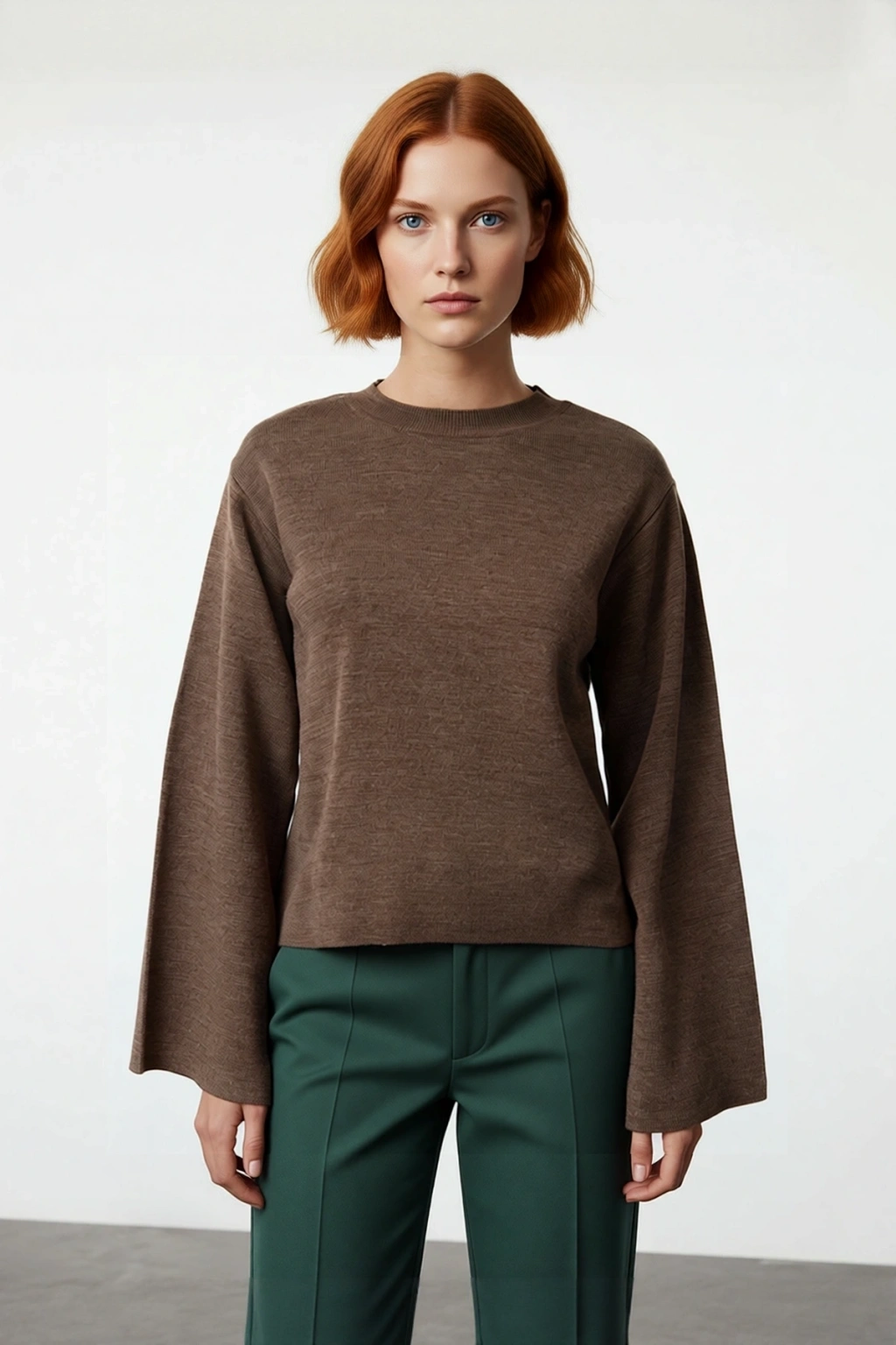 Ürün Özellikleri: Regular kalıp, akrilik materyal, düz desen, bisiklet yaka, İspanyol kol, triko kumaş, haki renk, uzun kol boyu.