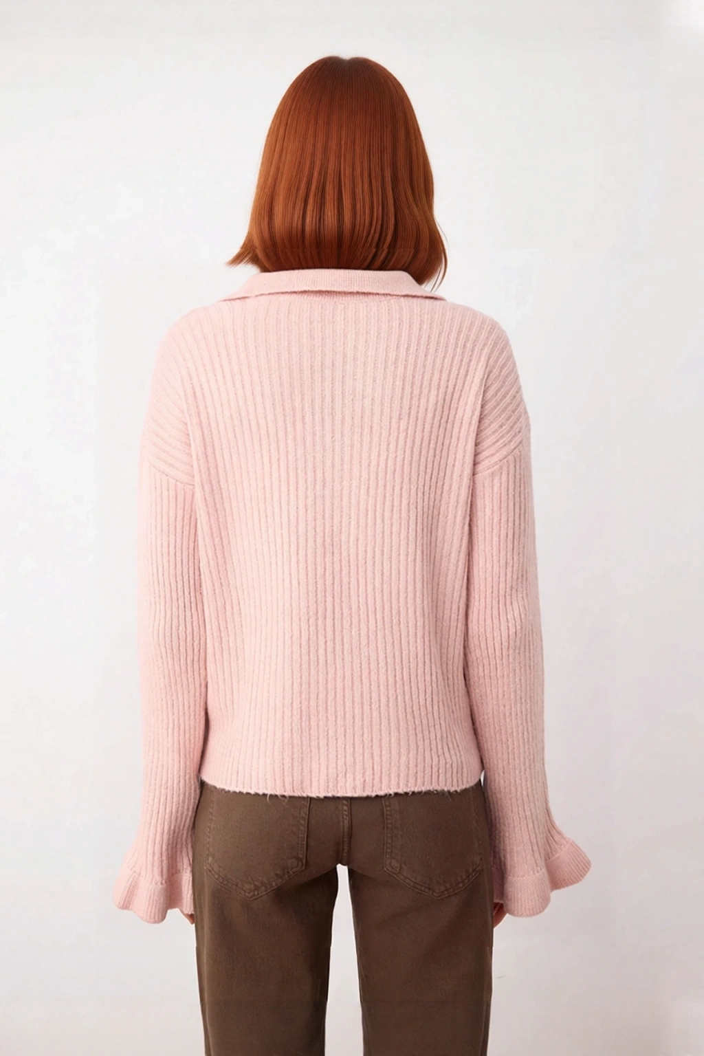 Ürün Özellikleri: Regular kalıp, 80% akrilik ve 20% polyester materyal, düz desen, apaş yaka, standart kol, triko kumaş, pembe renk.