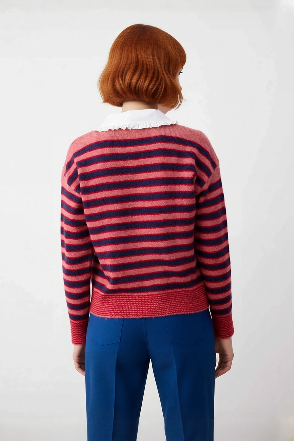 Ürün Özellikleri: Regular kalıp, 74% akrilik 26% polyester materyal, renk bloklu desen, çıkarılabilir yaka, düşük kol, triko kumaş, kırmızı renk.