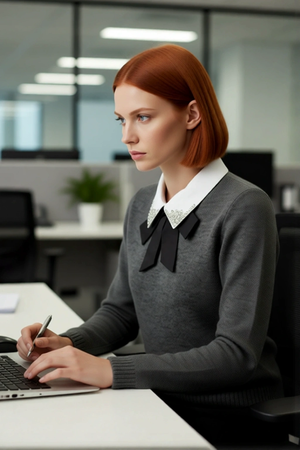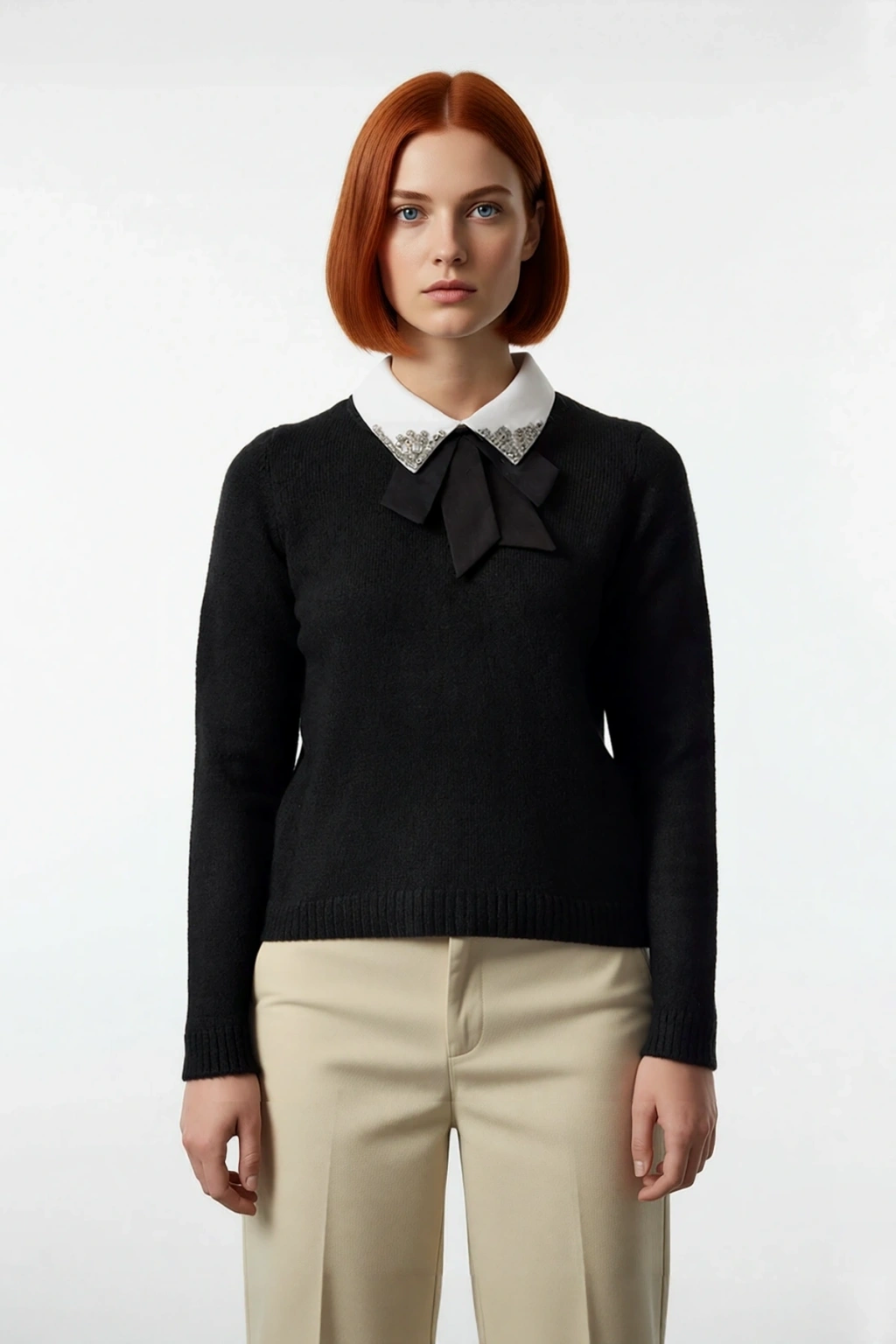 Kadınlar için tasarlanmış bu benzersiz triko kazak, regular kalıbı ile şıklığı ve konforu bir arada sunar. Akrilik ve polyester karışımı materyali sayesinde yumuşacık bir dokunuş ve etkili bir ısıtma özelliği sağlar, soğuk günlerde vazgeçilmeziniz olur. Antrasit rengi, gömlek garnili yaka detayı ile birleşerek klasik bir zarafet sunarken, yaka kısmındaki ışıltılı taşlar ve zarif kurdele fiyonk, kazağa feminen ve sofistike bir hava katar. Bu tasarım, her anınıza değer katacak, stil sahibi bir seçimdir.