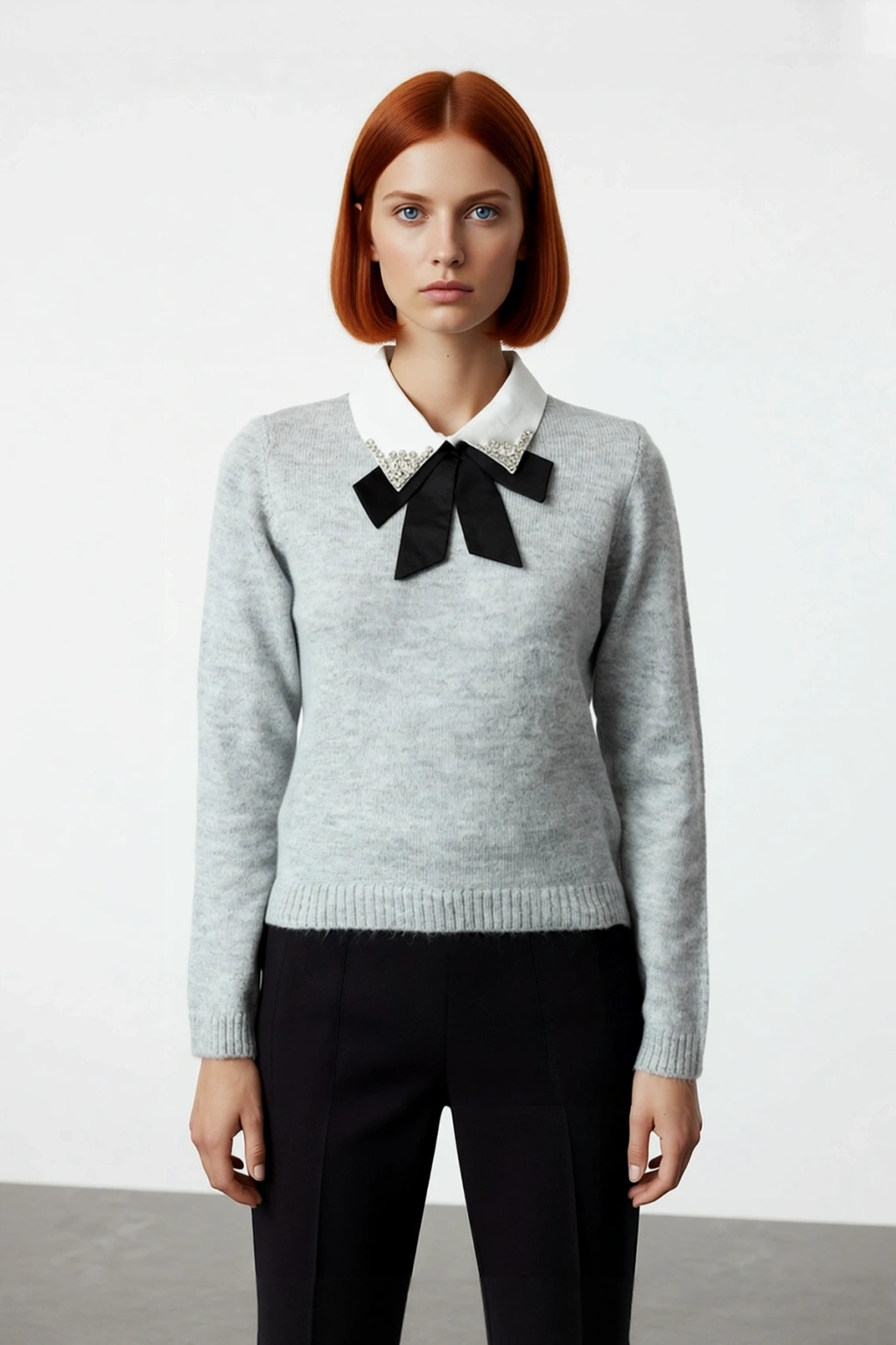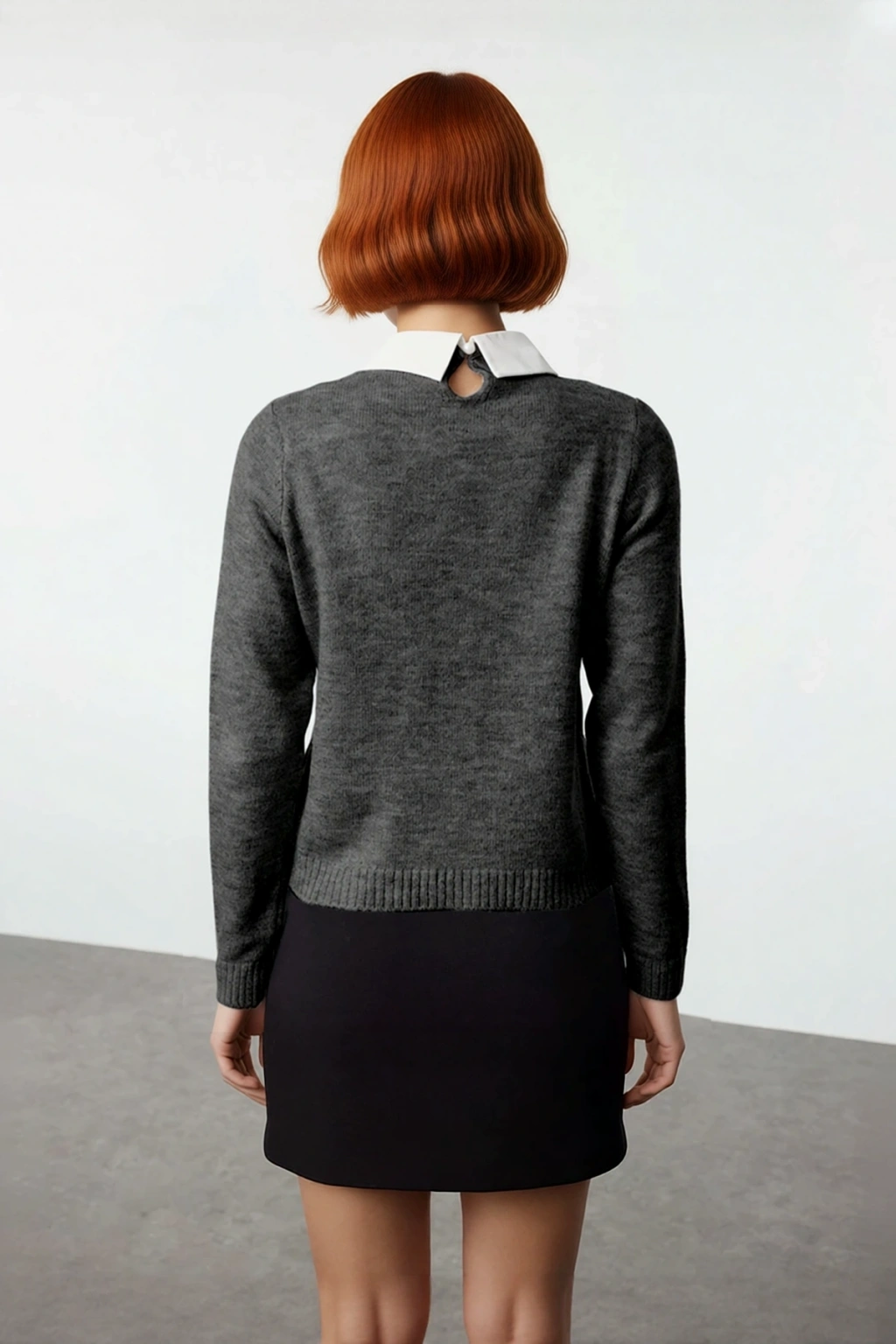 Ürün Özellikleri: Regular kalıp, Akrilik materyal, Nakışlı / İşlemeli desen, Gömlek Yaka Görünümlü, Standart kol, Triko kumaş, Gri renk.