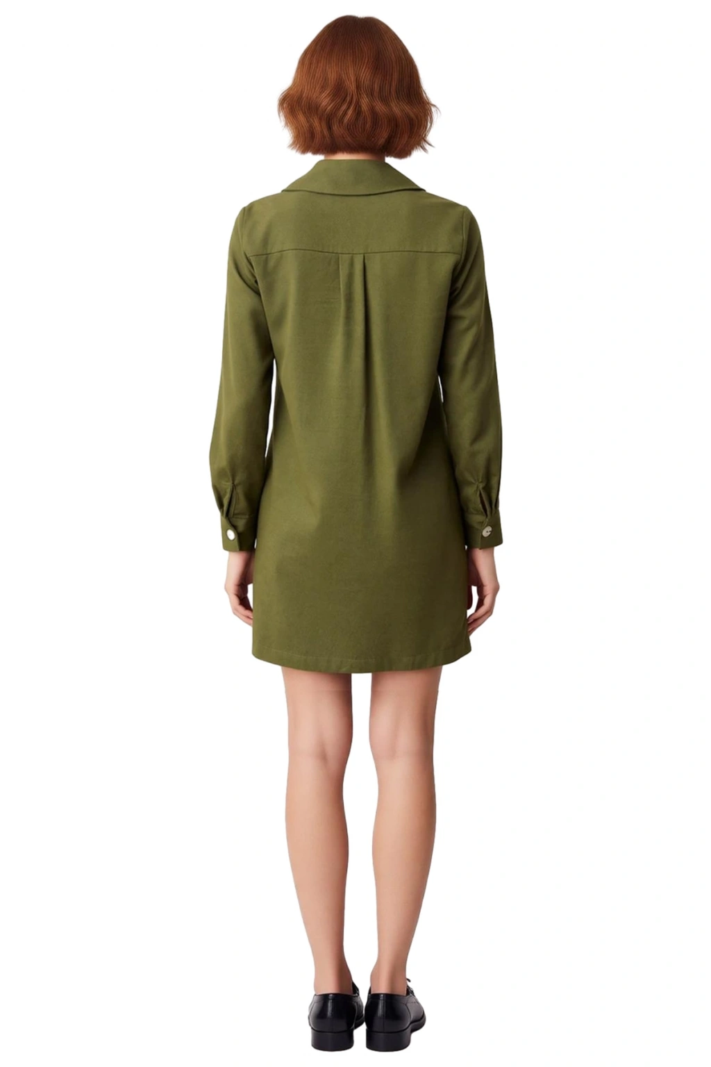 Ürün Özellikleri: Gömlek Elbise kalıp, %100 pamuk materyal, düz desen, gömlek yaka, standart kol, dokuma kumaş, haki renk, bağlama detaylı.