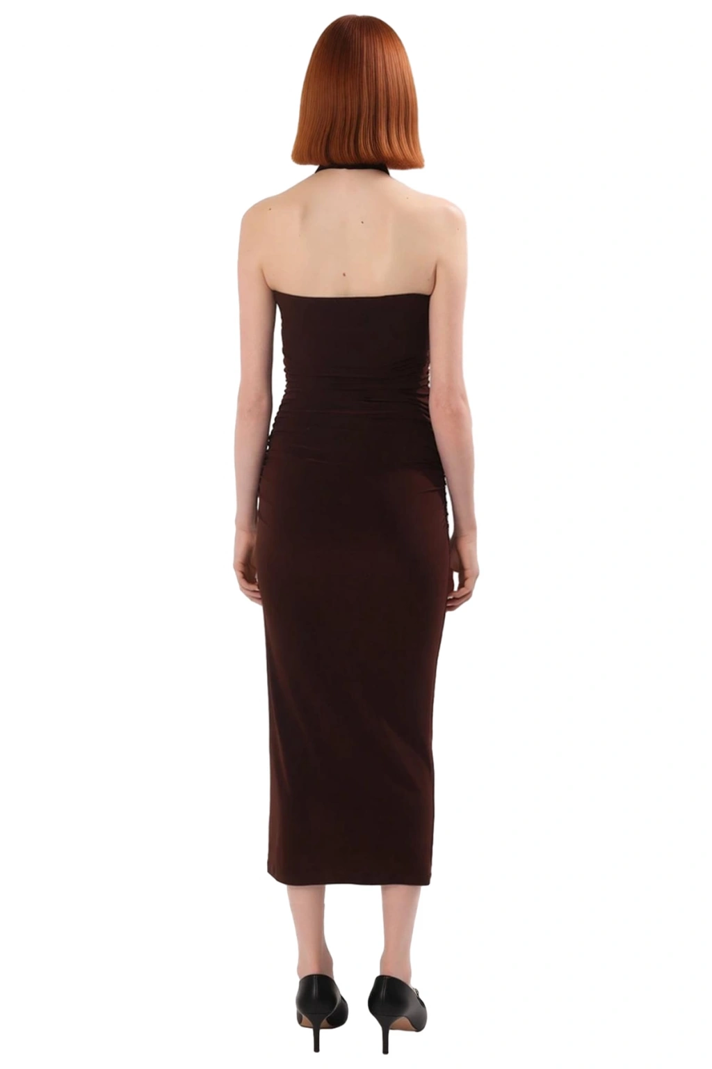 Ürün Özellikleri: Bodycon kalıp, polyester materyal, düz desen, asimetrik yaka, kolsuz, örme kumaş, kahverengi renk, aksesuar detaylı.