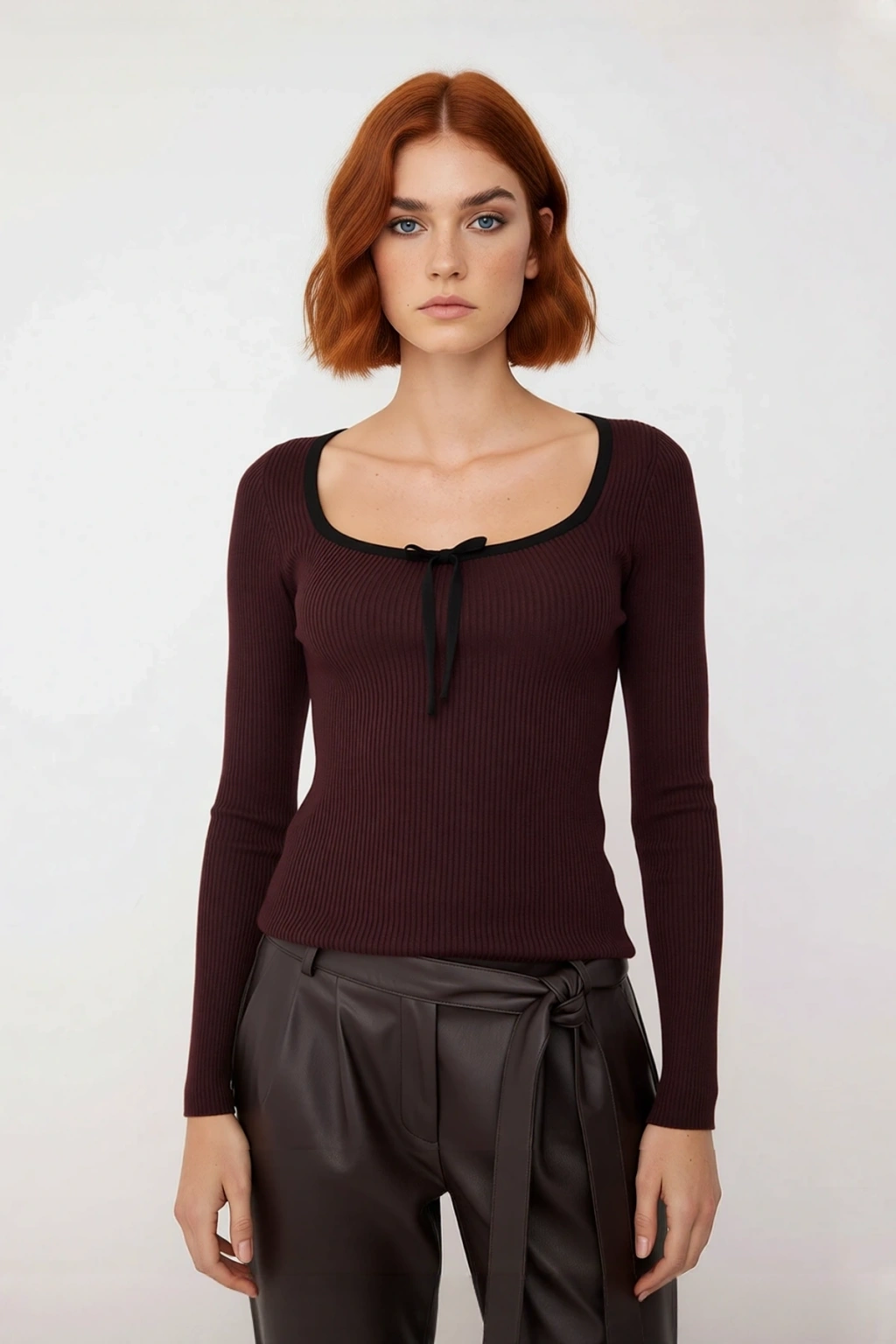 Ürün Özellikleri: Fitted kalıp, akrilik polyester viskoz materyal, fitilli dokuma, havuz yaka, standart kol, triko kumaş, bordo renk, kurdele fiyonk detaylı.
