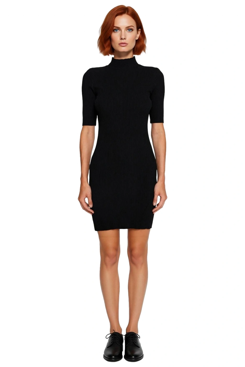 Ürün Özellikleri: Bodycon kalıp, akrilik materyal, düz desen, dik yaka, kısa kol, triko kumaş, siyah renk.