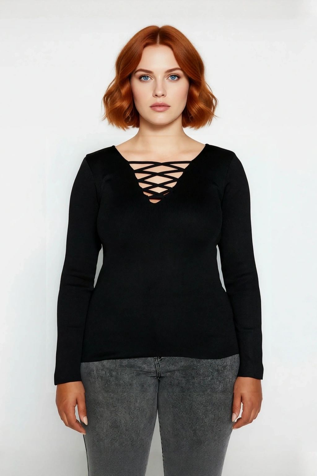 Uzun standart kolları, hem şıklığı tamamlar hem de serin havalarda ekstra koruma sağlar. İnce triko kumaş dokusu, bluzun hafifliğini ve nefes alabilirliğini artırarak dört mevsim giyilebilirliğini destekler. Bodycone silueti, feminen hatları öne çıkarırken, tek plaka dokuma kalitesi sayesinde uzun ömürlü kullanım sunar. Yaka kısmındaki çapraz detaylar, tasarıma özgünlük katarken, bluzun genel estetiğini güçlendirir. Kolay yıkanabilir polyester materyali, bakımını zahmetsiz hale getirir.
