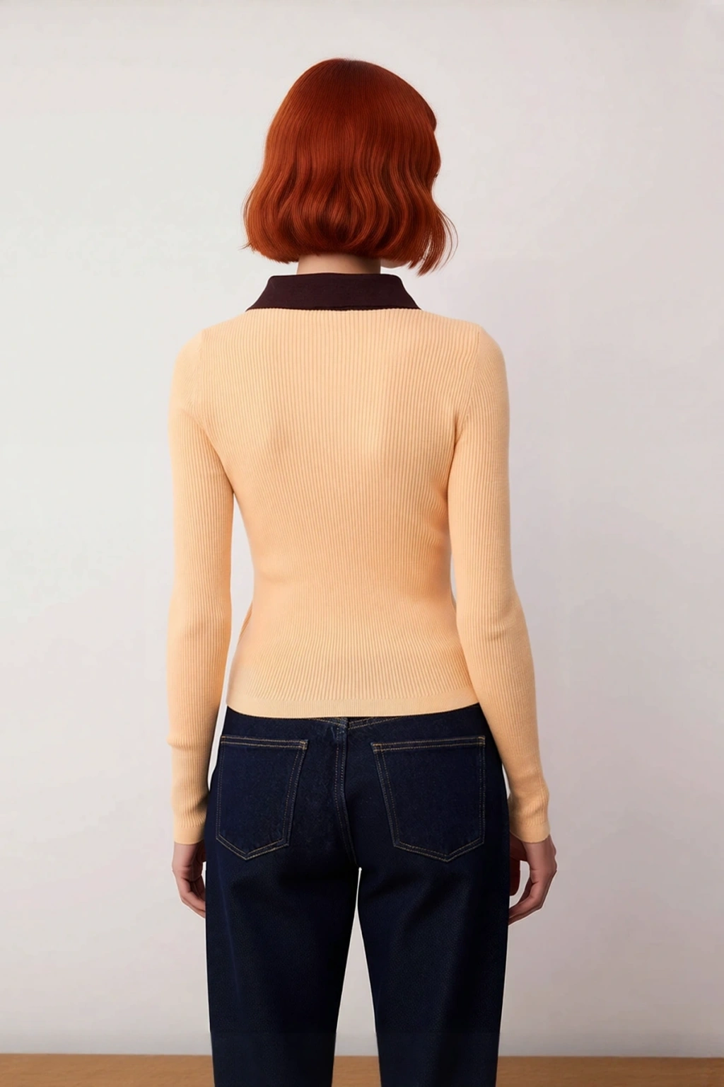 Ürün Özellikleri: Fitted kalıp, viskoz polyester poliamid materyal, renk bloklu desen, polo yaka, standart uzun kol, fitilli triko kumaş, açık turuncu renk, baskısız tasarım.