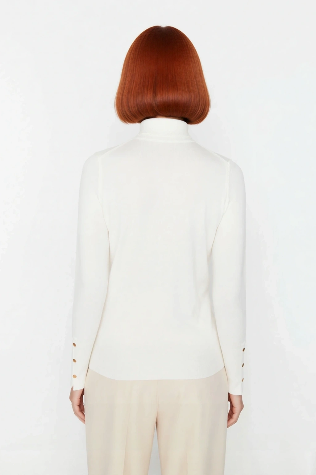 Ürün Özellikleri: Fitted kalıp, viskoz polyester poliamid materyal, düz desen, balıkçı yaka, standart kol, triko kumaş, ekru renk.