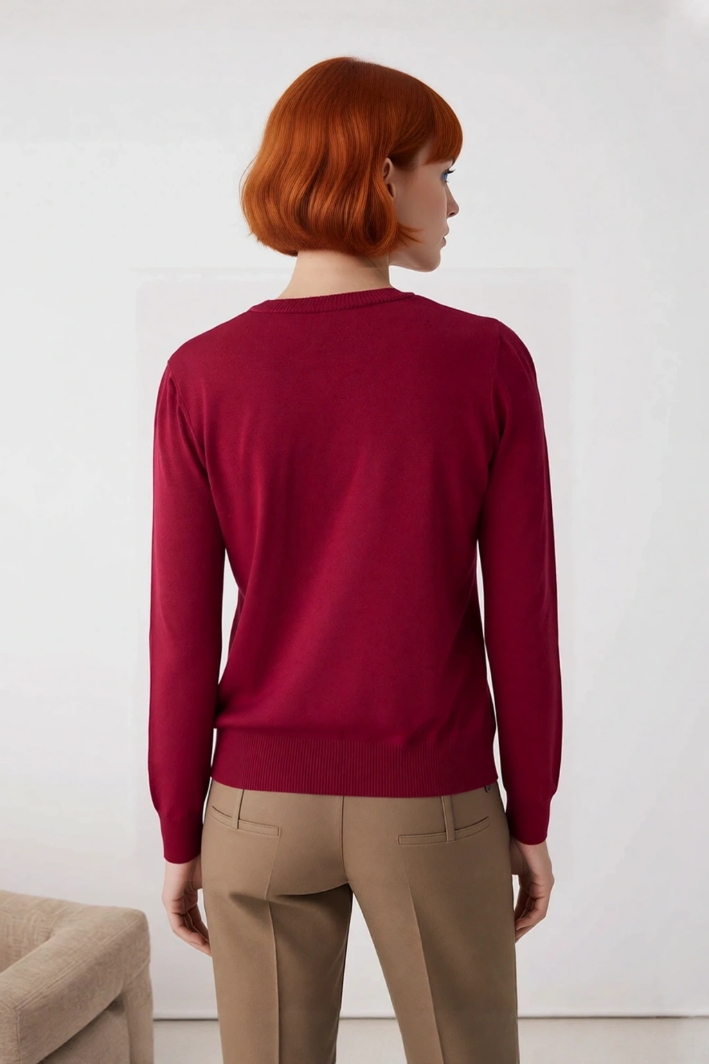 Ürün Özellikleri: Regular kalıp, %60 Polyester %40 Viskoz materyal, düz desen, bisiklet yaka, standart kol, triko kumaş, bordo renk, ince kalınlık.
