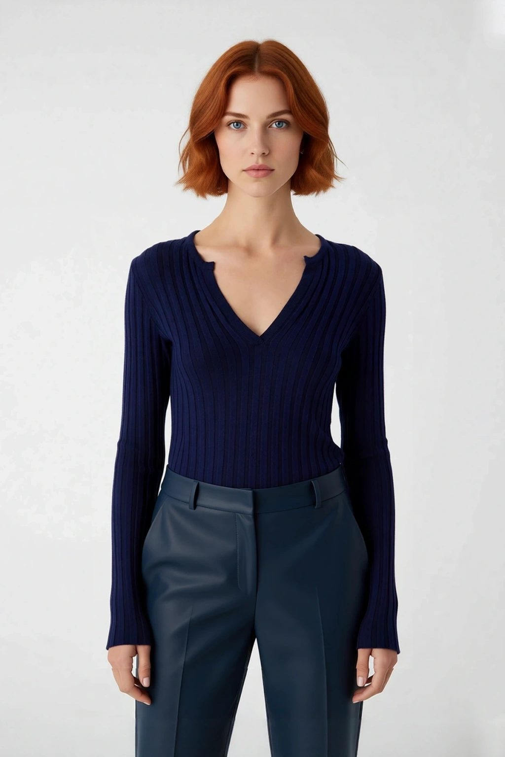 Ürün Özellikleri: Fitted kalıp, viskoz akrilik materyal, fitilli dokuma, kaçık yaka, standart uzun kol, triko kumaş, lacivert renk, düz desen.