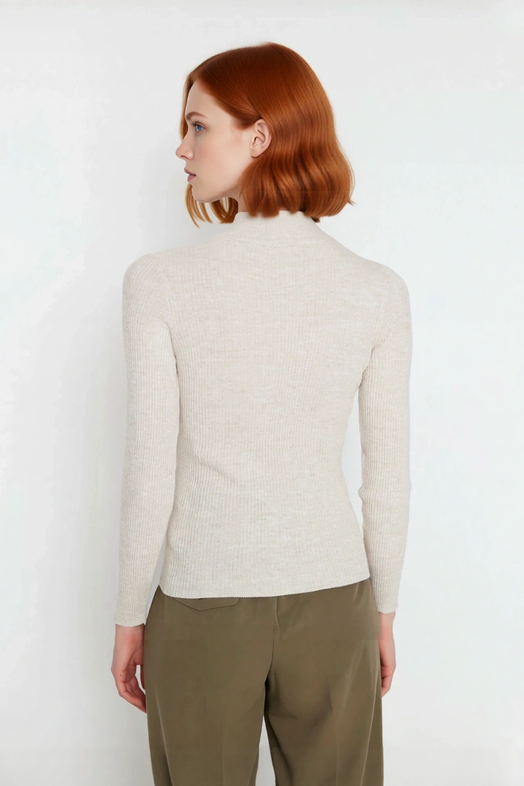 Ürün Özellikleri: Fitted kalıp, akrilik materyal, ajurlu desen, dik yaka, standart kol, triko kumaş, gri renk, baskısız tasarım.