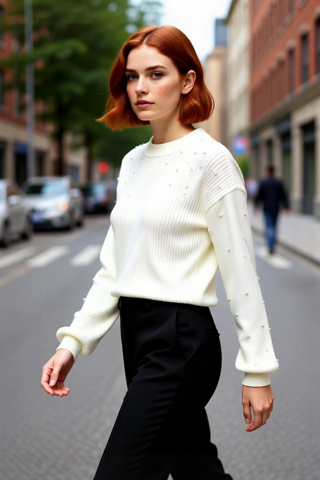 Ürün Özellikleri: Regular kalıp, akrilik materyal, inci detaylı desen, bisiklet yaka, düşük kol, triko kumaş, ekru renk, cepsiz tasarım.