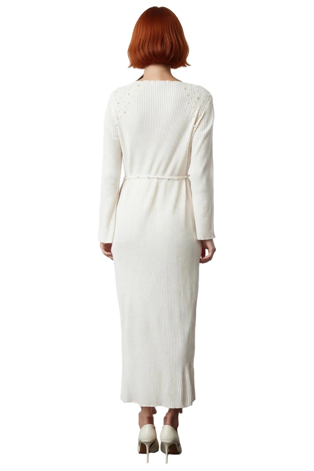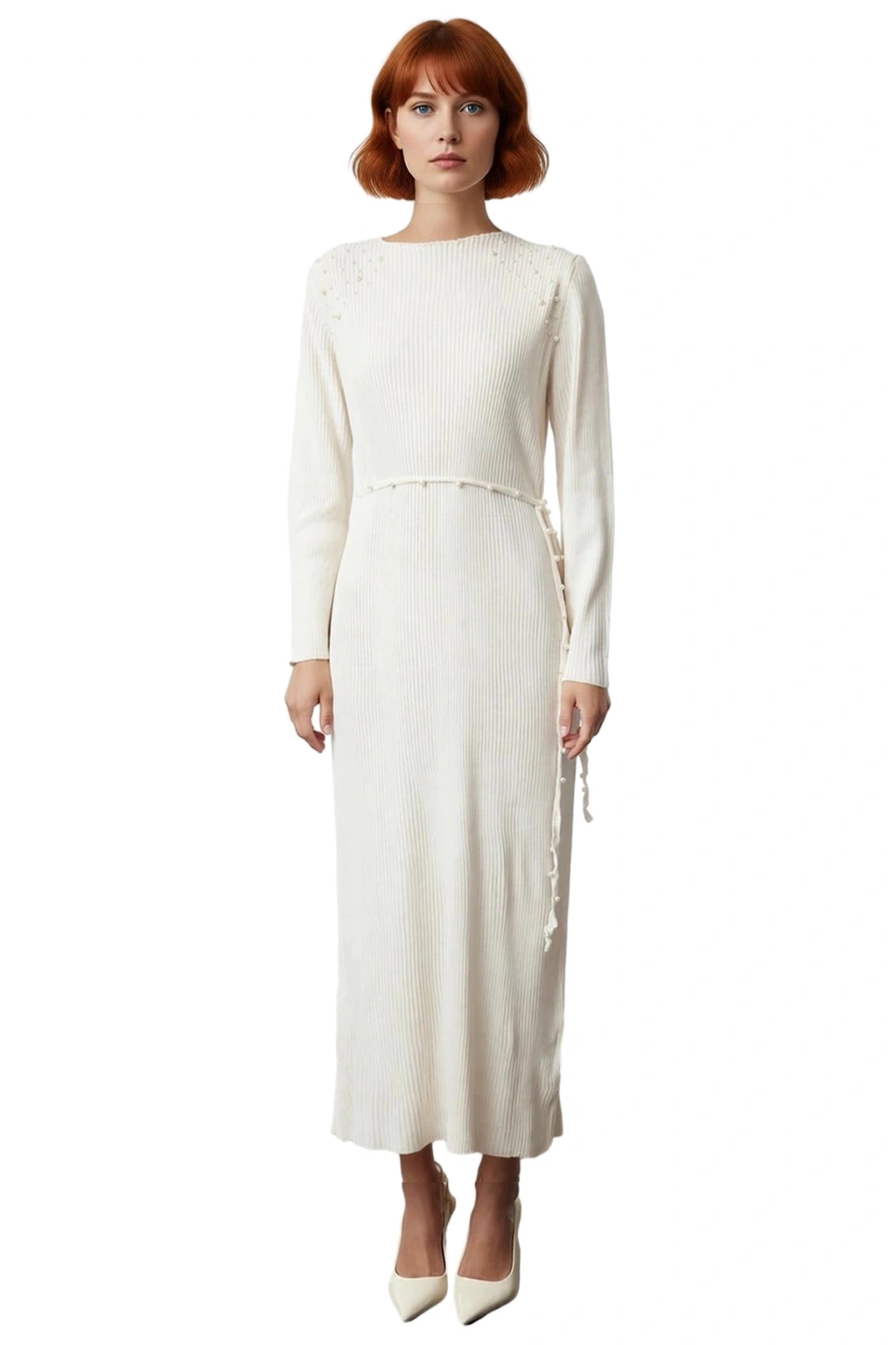 Elbisenin dik yaka tasarımı, soğuk havalarda boynunuzu korurken şık bir bitiş sağlar. Uzun standart kolları, rahat bir kullanım sunar ve ribana/kaşkorse dokuma tipine sahip triko kumaşı, esnekliği ve dayanıklılığı ile öne çıkar. Astarsız yapısıyla hafif bir his verirken, vücudunuzu saran ancak sıkmayan bir konfor sunar. Kuşaklı detayı, belinizi vurgulayarak daha feminen bir görünüm elde etmenizi sağlar. Cepsiz tasarımı, elbisenin akıcı ve pürüzsüz çizgisini korur. Pratik T41 yıkama talimatları sayesinde bakımı son derece kolaydır, bu da yoğun yaşam tarzına sahip kadınlar için büyük bir avantajdır.