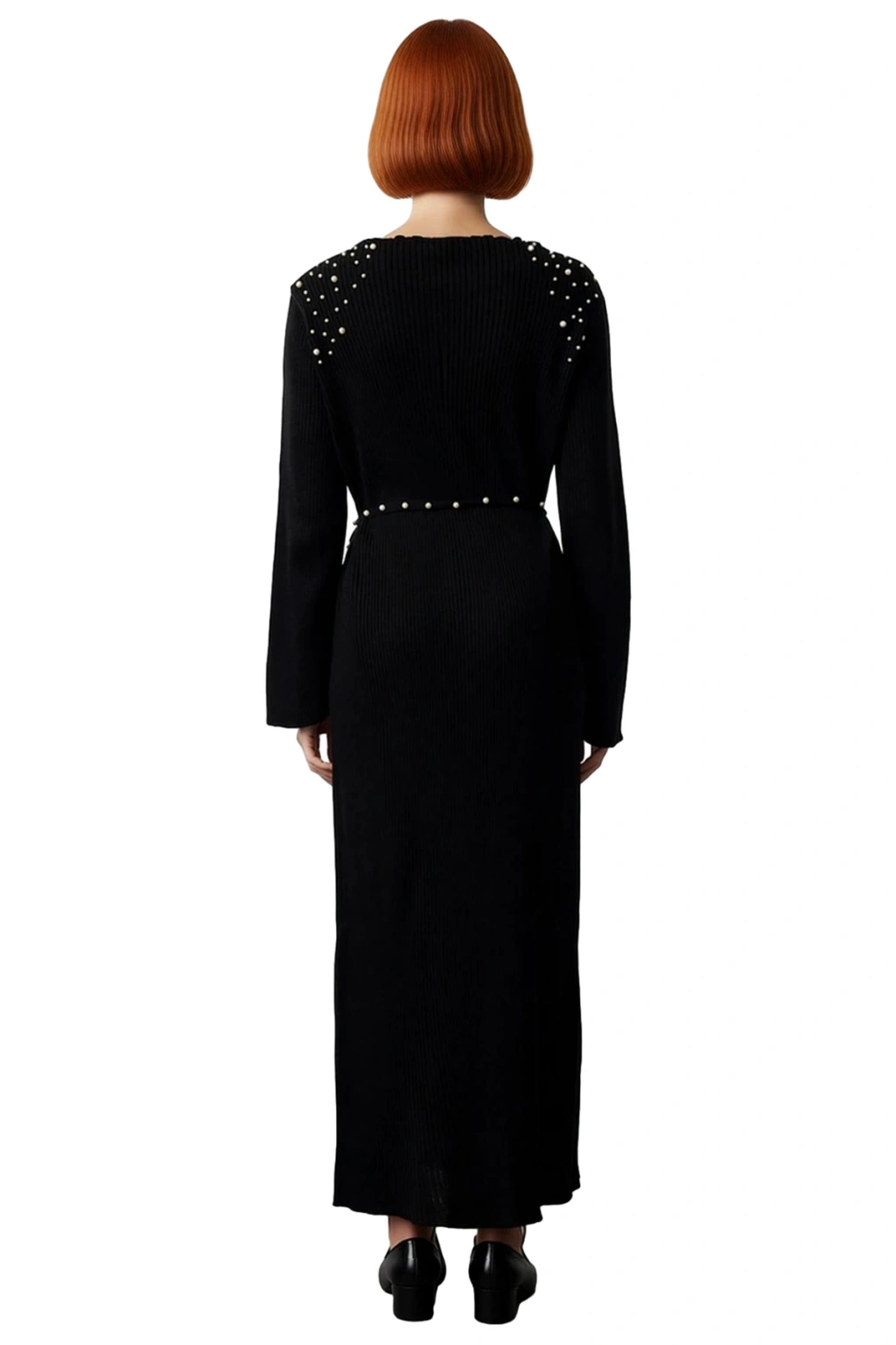 Ürün Özellikleri: Shift kalıp, akrilik materyal, düz desen, dik yaka, standart kol, triko kumaş, siyah renk, incili detay, kuşaklı.