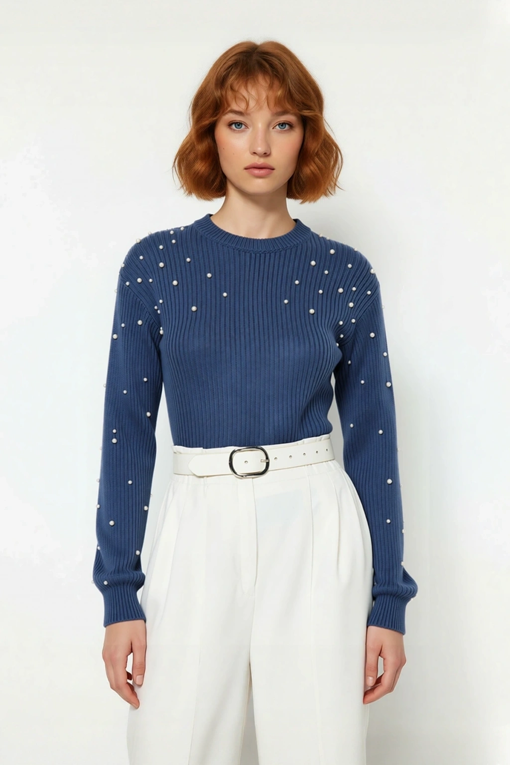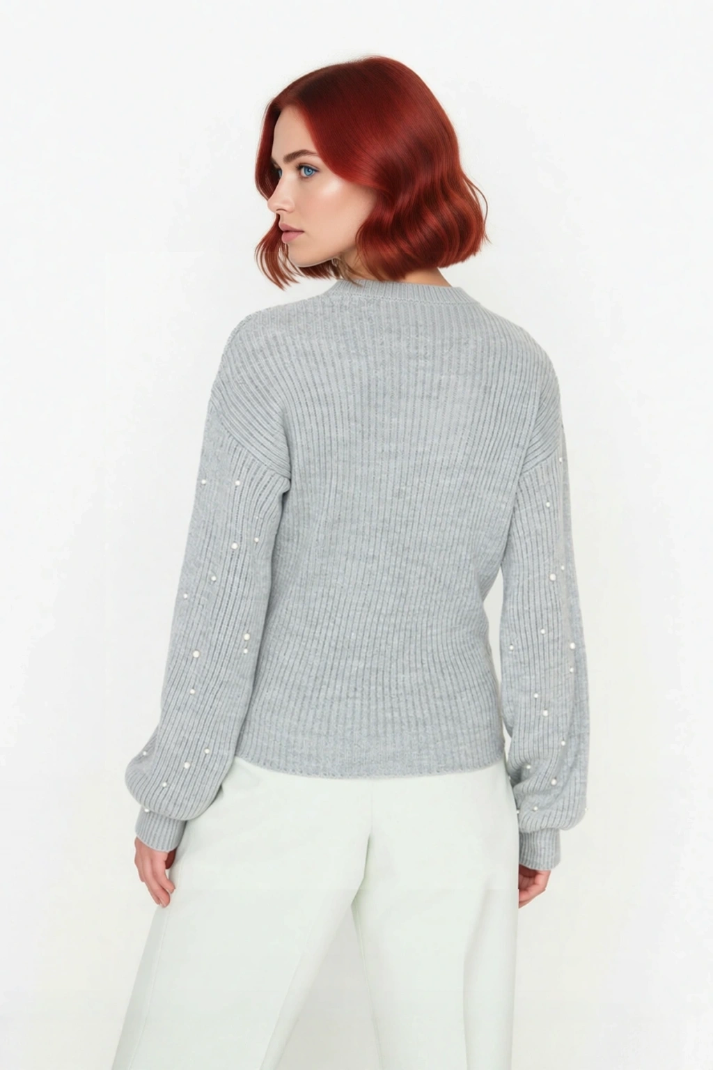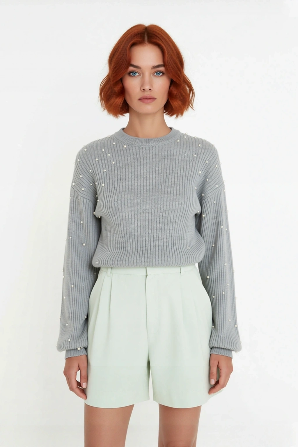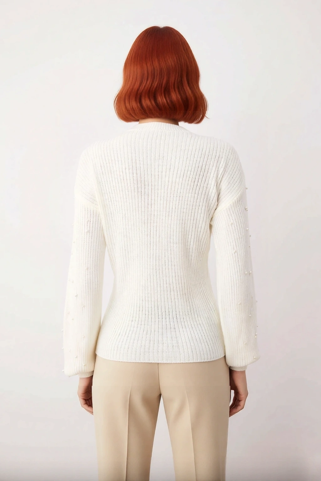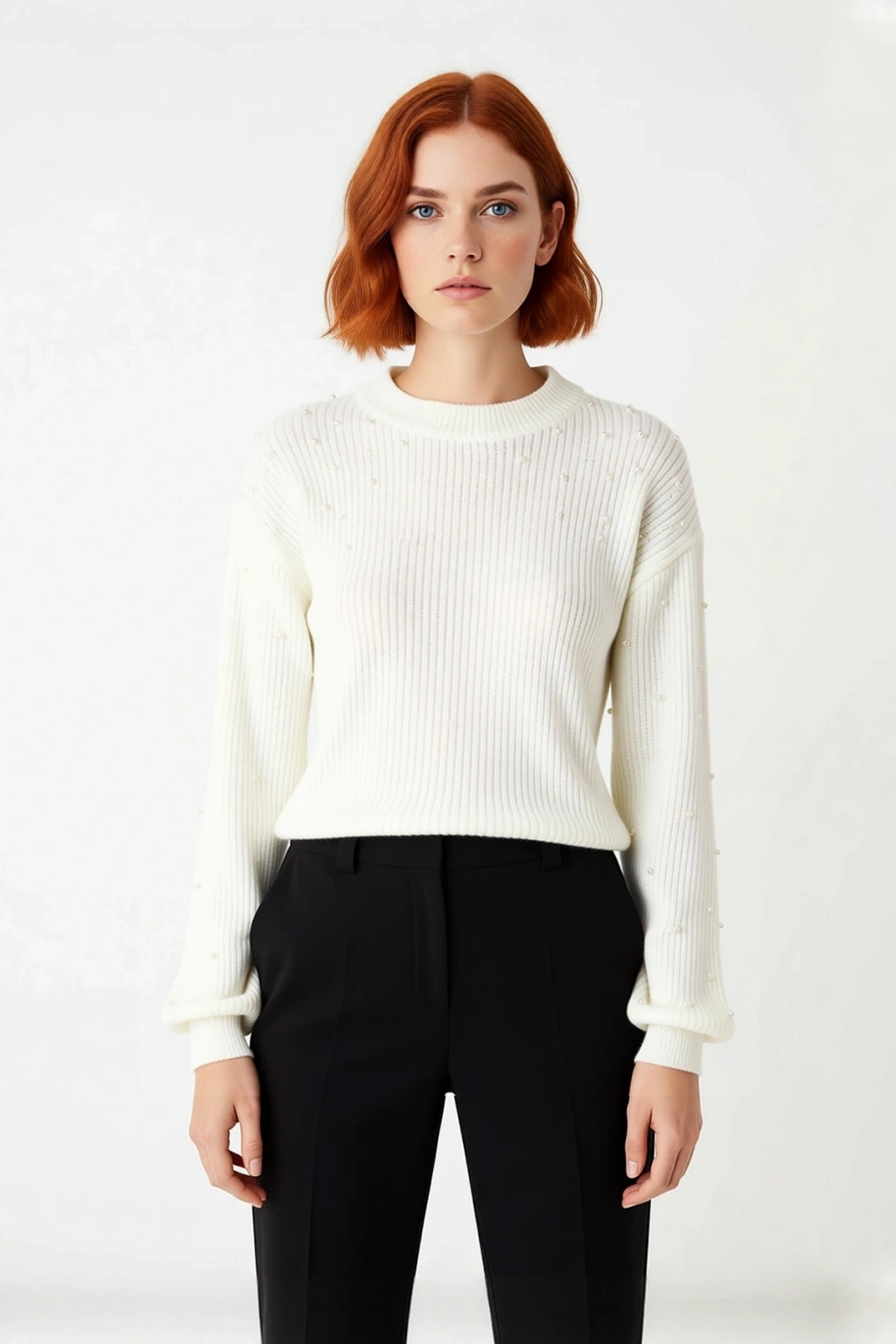 Ürün Özellikleri: Regular kalıp, akrilik materyal, inci detaylı desen, bisiklet yaka, düşük kol, triko kumaş, ekru renk, cepsiz tasarım.
