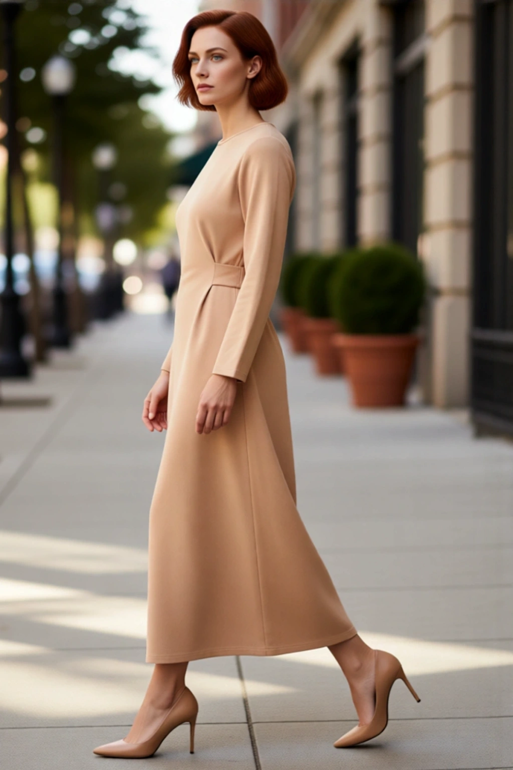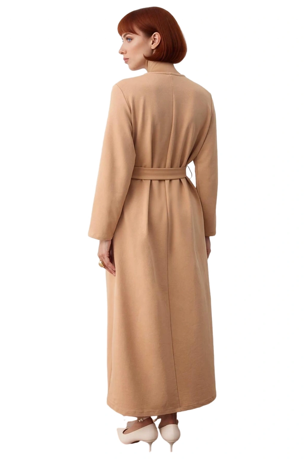 Ürün Özellikleri: A-line kalıp, örme kumaş, düz desen, bisiklet yaka, standart kol, interlok dokuma, kahverengi renk, astarsız tasarım, uzun kol boyu.