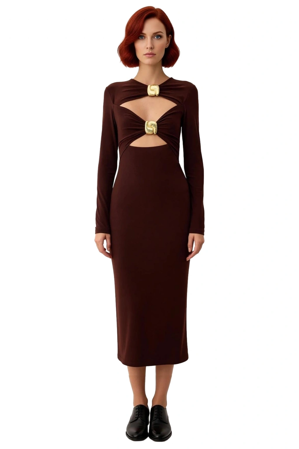 Bu kadın kahverengi bodycon midi elbise, vücuda oturan kesimiyle modern ve çarpıcı bir siluet sunar. Yüksek kaliteli sandy örme kumaşı sayesinde hem esneklik hem de konfor sağlarken, polyester ve elastan karışımı materyali gün boyu rahat bir kullanım vadediyor. Düz deseni sade şıklığı ön plana çıkarırken, göğüs kısmındaki aksesuar detayları elbiseye sofistike ve özgün bir hava katıyor. Kahverengi tonu ise zarafeti ve asil duruşuyla özel davetlerin vazgeçilmezi olmaya aday. Fashion forward persona için tasarlanmış bu model, cesur ve stil sahibi kadınların tercihi.