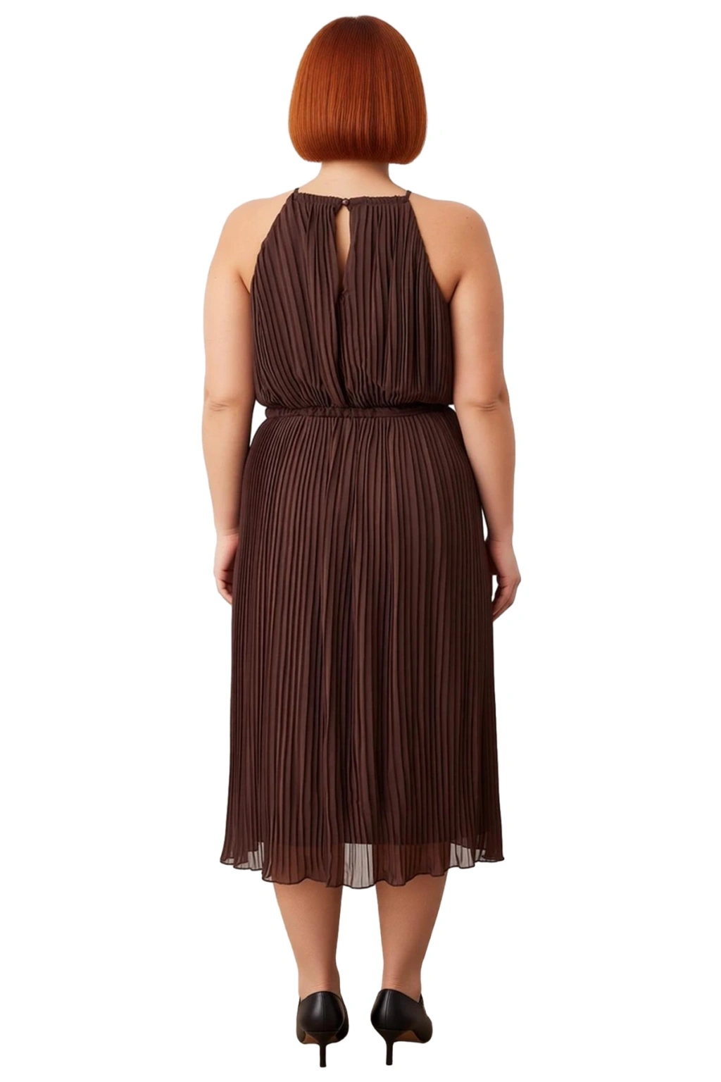 Ürün Özellikleri: Bodycon kalıp, %100 Polyester materyal, düz desen, halter yaka, kolsuz, dokuma şifon kumaş, kahverengi renk.