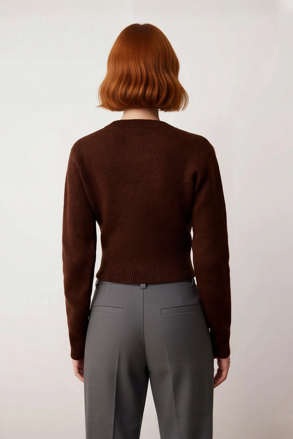 Bu kahverengi kadın triko kazak, regular kalıbı ile gün boyu rahatlık ve şıklığı bir arada sunar. Vücuda tam oturmayan ancak stil sahibi bir duruş sergileyen bu parça, 72% akrilik ve 28% polyester materyal bileşimi sayesinde hem yumuşak bir dokunuş hissi verir hem de serin havalarda sıcak tutar. Düz deseni ile her kombine kolayca uyum sağlarken, crop boy kesimi modern ve dinamik bir görünüm kazandırır. Ön kısmındaki korse fermuar detayı, tasarıma eşsiz bir hava katarak sıradanlıktan uzaklaşmanızı sağlar. Bu özel kazak, "Cool & Comfort" personasını benimseyen kadınlar için idealdir, tarzınızla fark yaratmanızı garantiler.