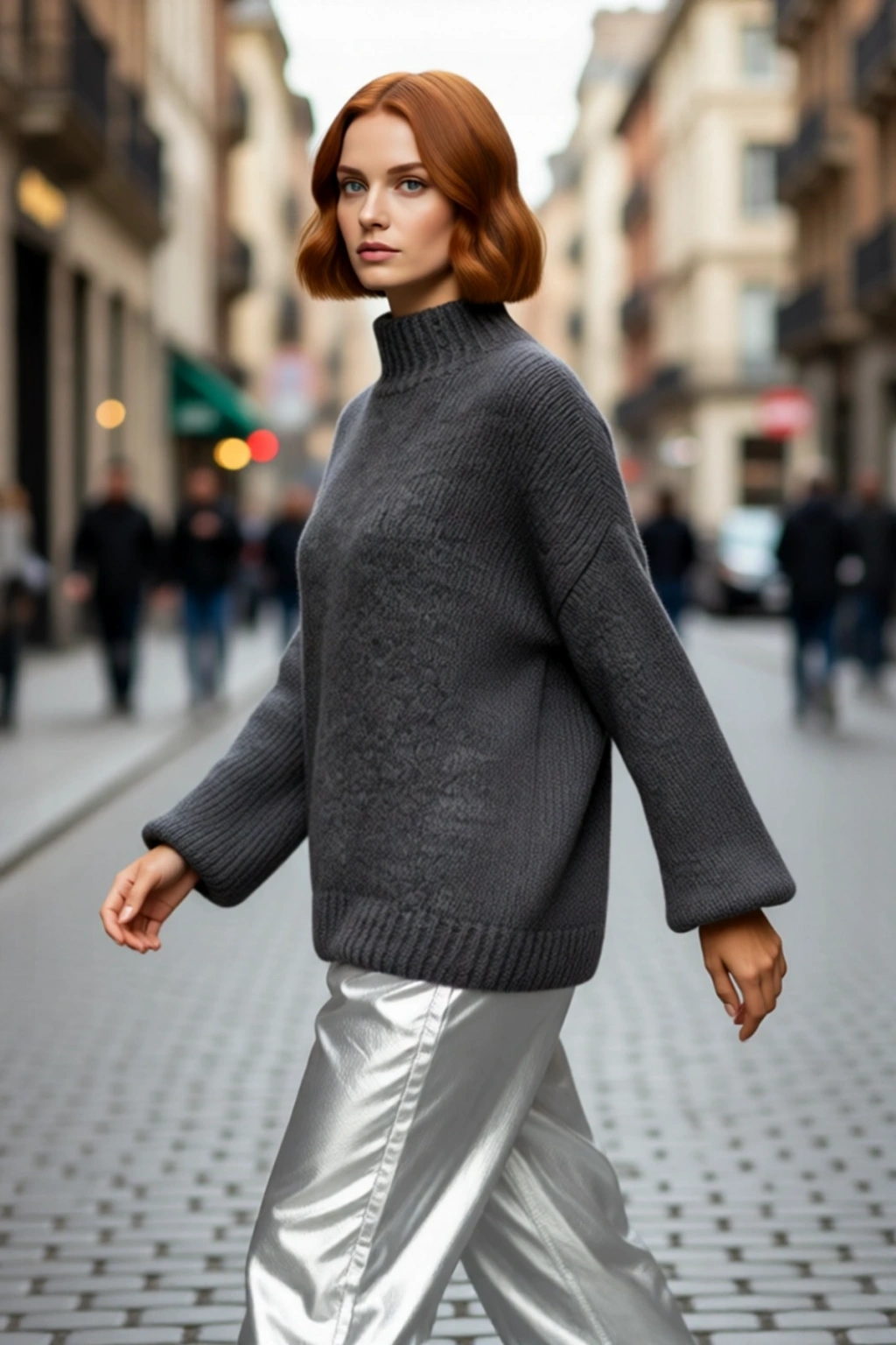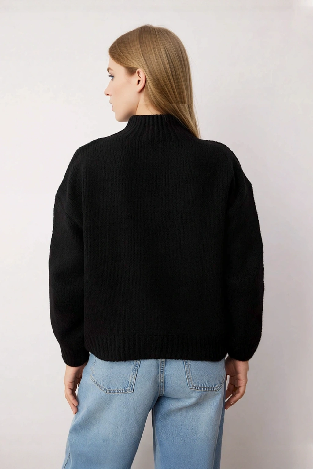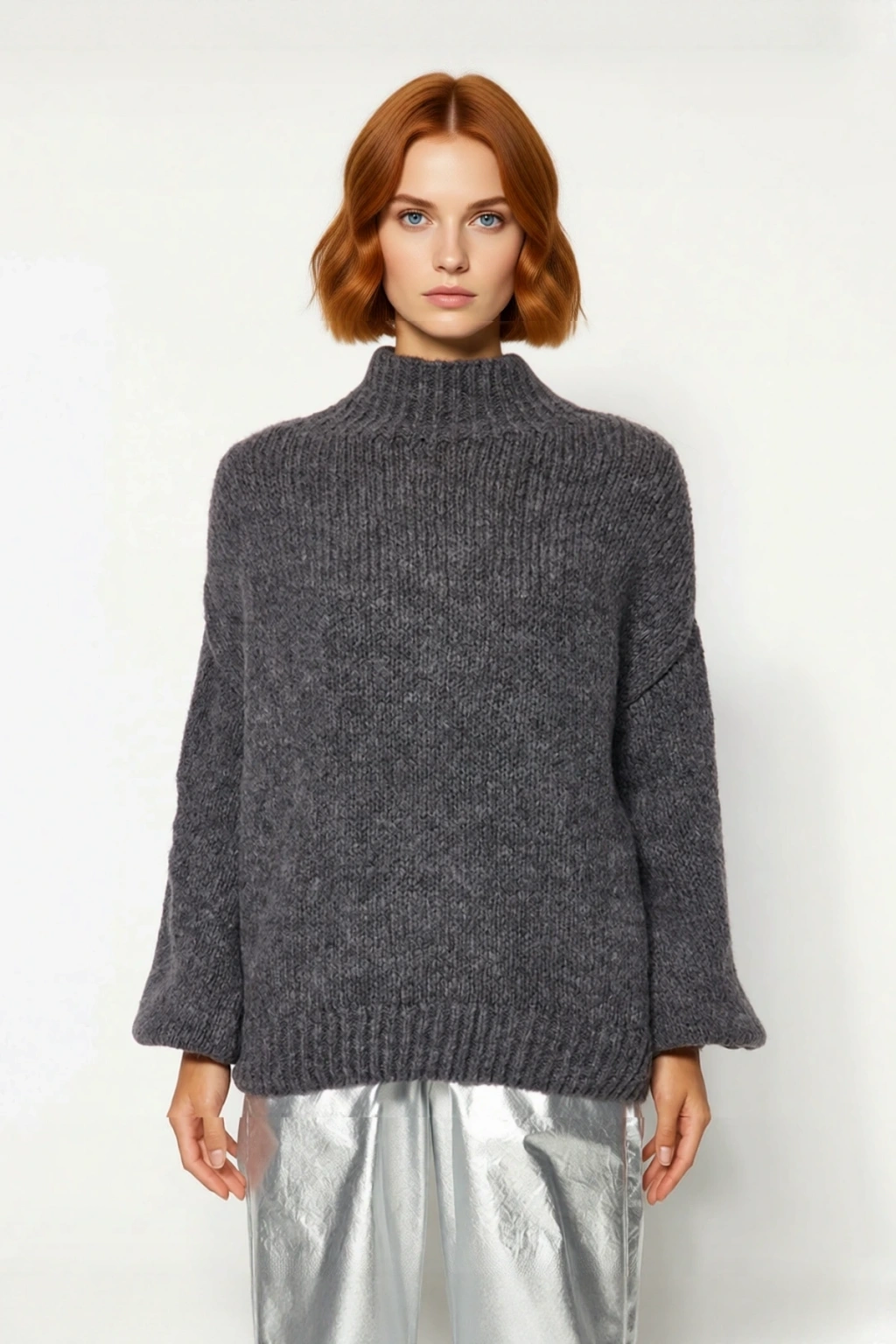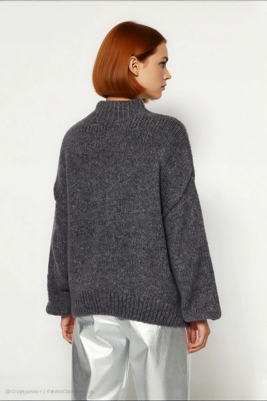 Ürün Özellikleri: Oversize kalıp, 80% Akrilik 20% Polyester materyal, düz desen, dik yaka, standart kol, triko kumaş, antrasit renk, baskısız tasarım.