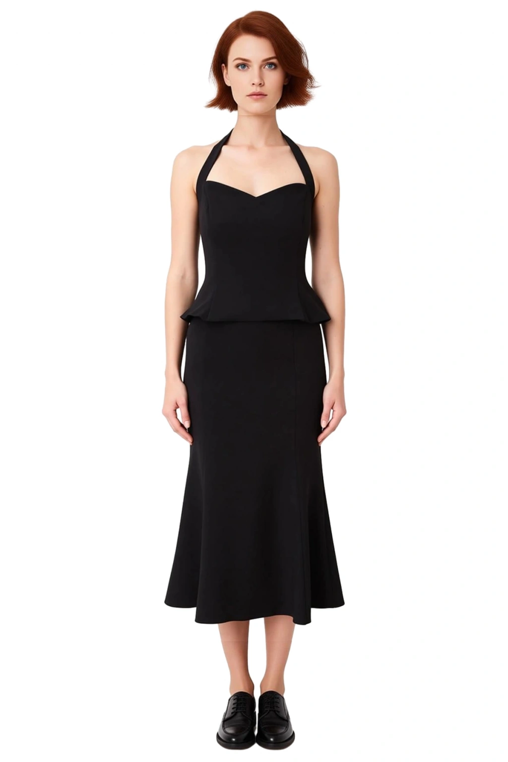 Bu çarpıcı kadın elbisesi, balık kalıbı ile vücuda mükemmel bir şekilde oturarak kum saati formunu vurgulayan, son derece zarif ve feminen bir siluet sunar. Yüksek kaliteli dokuma kumaştan üretilen bu elbise, %88 polyester ve %12 elastan materyal bileşimi sayesinde gün boyu esneklik, konfor ve hareket özgürlüğü sağlar. Düz deseni ve göz alıcı siyah rengiyle birleşerek minimalist ancak etkileyici bir şıklık yaratır. Kalp yaka tasarımı, dekolteye narin bir dokunuş katarken, kadınsı çekiciliği ön plana çıkarır ve özel gecelerinizin vazgeçilmezi olmaya adaydır. Bu elbise, zarafeti ve modern tasarımı bir araya getirerek kendinizi özel hissetmenizi garantiler.