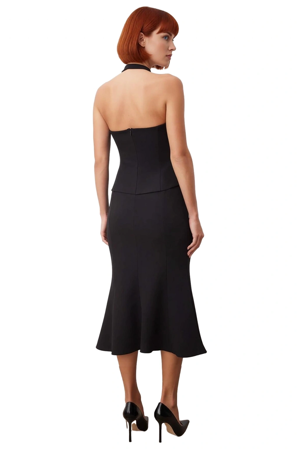 Ürün Özellikleri: Balık kalıp, %88 polyester %12 elastan materyal, düz desen, kalp yaka, kalın askılı kol, dokuma kumaş, siyah renk.