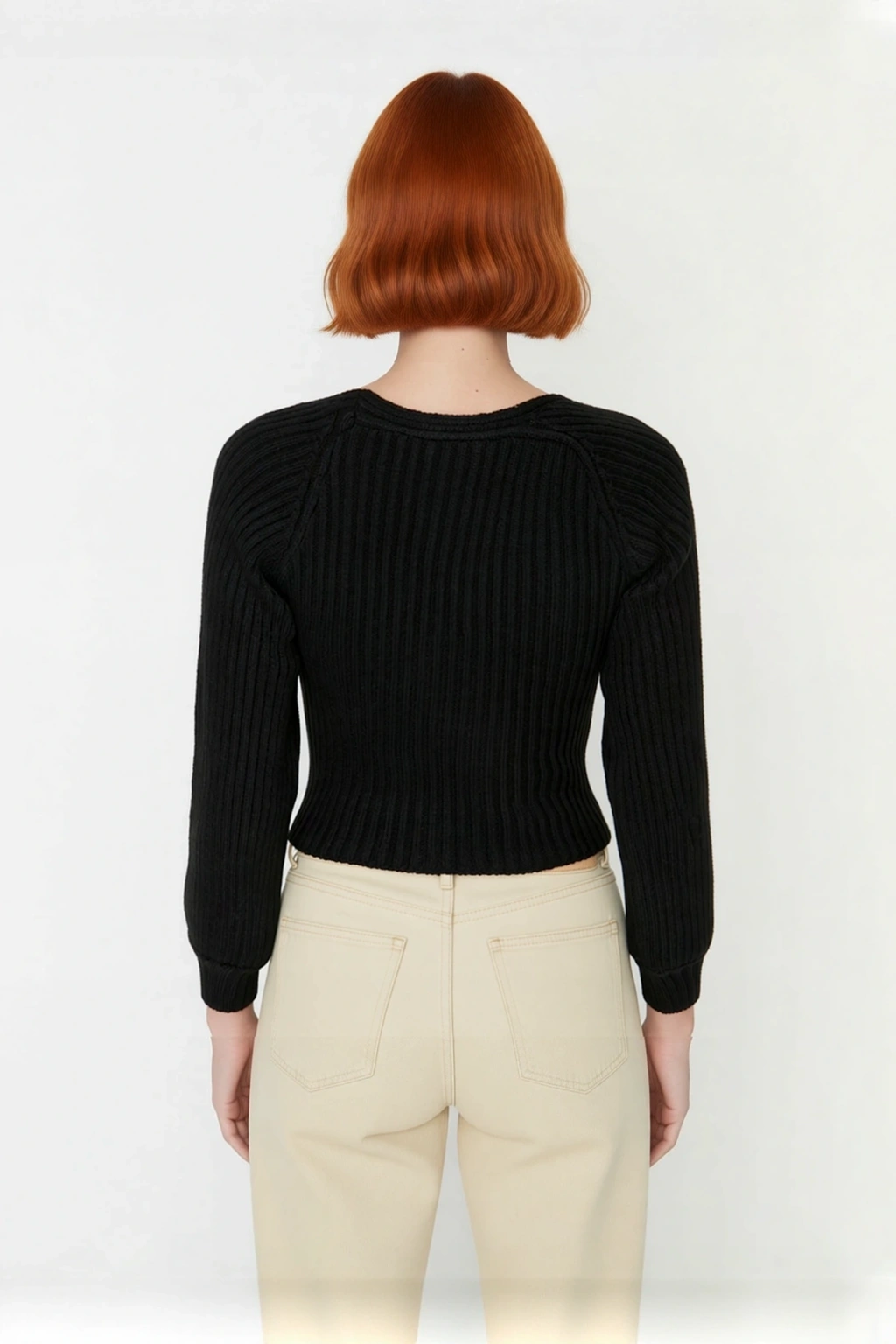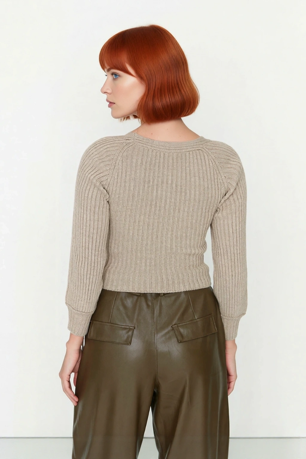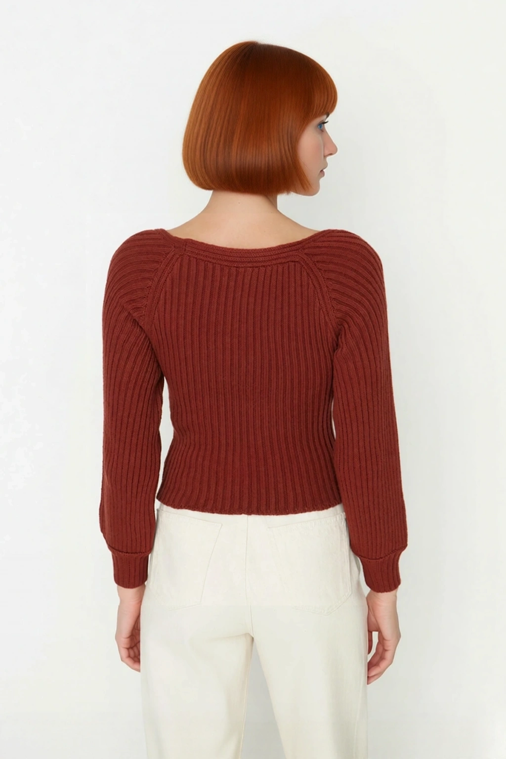 Ürün Özellikleri: Regular kalıp, akrilik materyal, düz desen, kalp yaka, standart kol, triko kumaş, kahverengi renk, crop boy, cepsiz tasarım, fitilli dokuma.