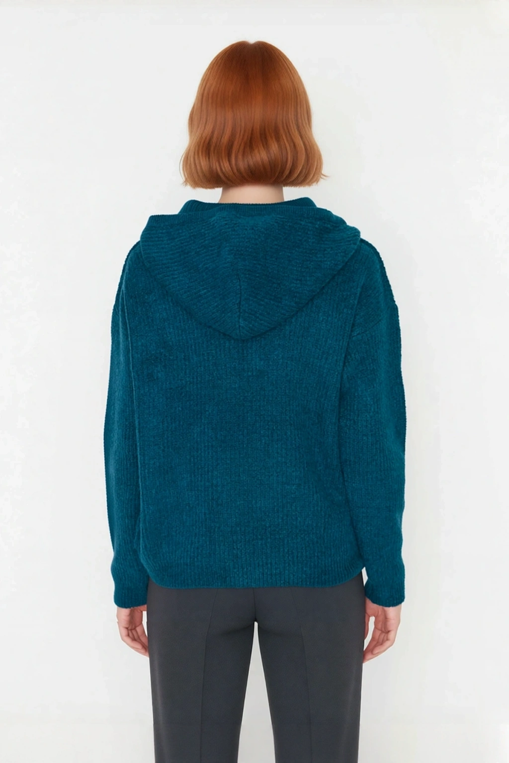 Ürün Özellikleri: Oversize kalıp, akrilik polyester materyal, düz desen, kapüşonlu yaka, düşük kol, triko kumaş, yeşil renk.